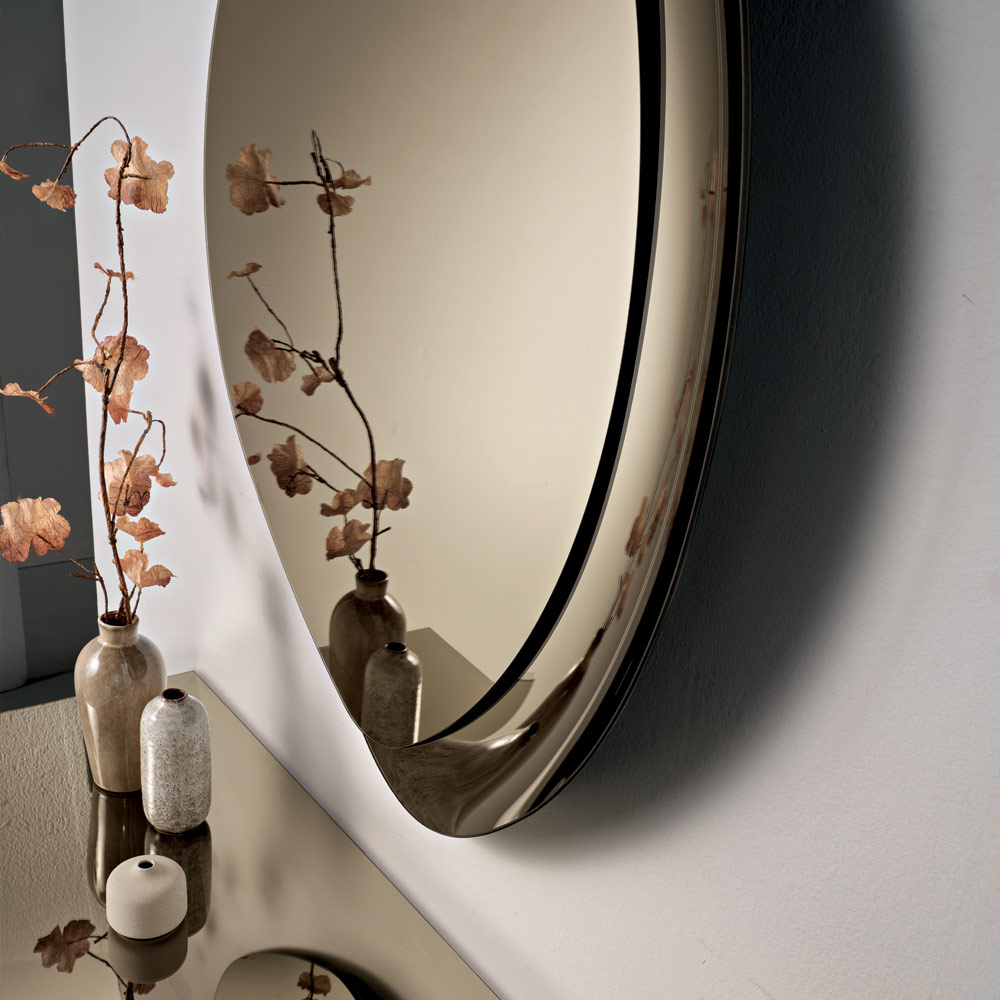 Le design se caractérise par un demi-cadre original en verre fusionné ton sur ton qui encadre partiellement la surface réfléchissante. Ce détail apporte texture et luminosité , créant un jeu de reflets captivant qui confère au miroir profondeur et caractère.