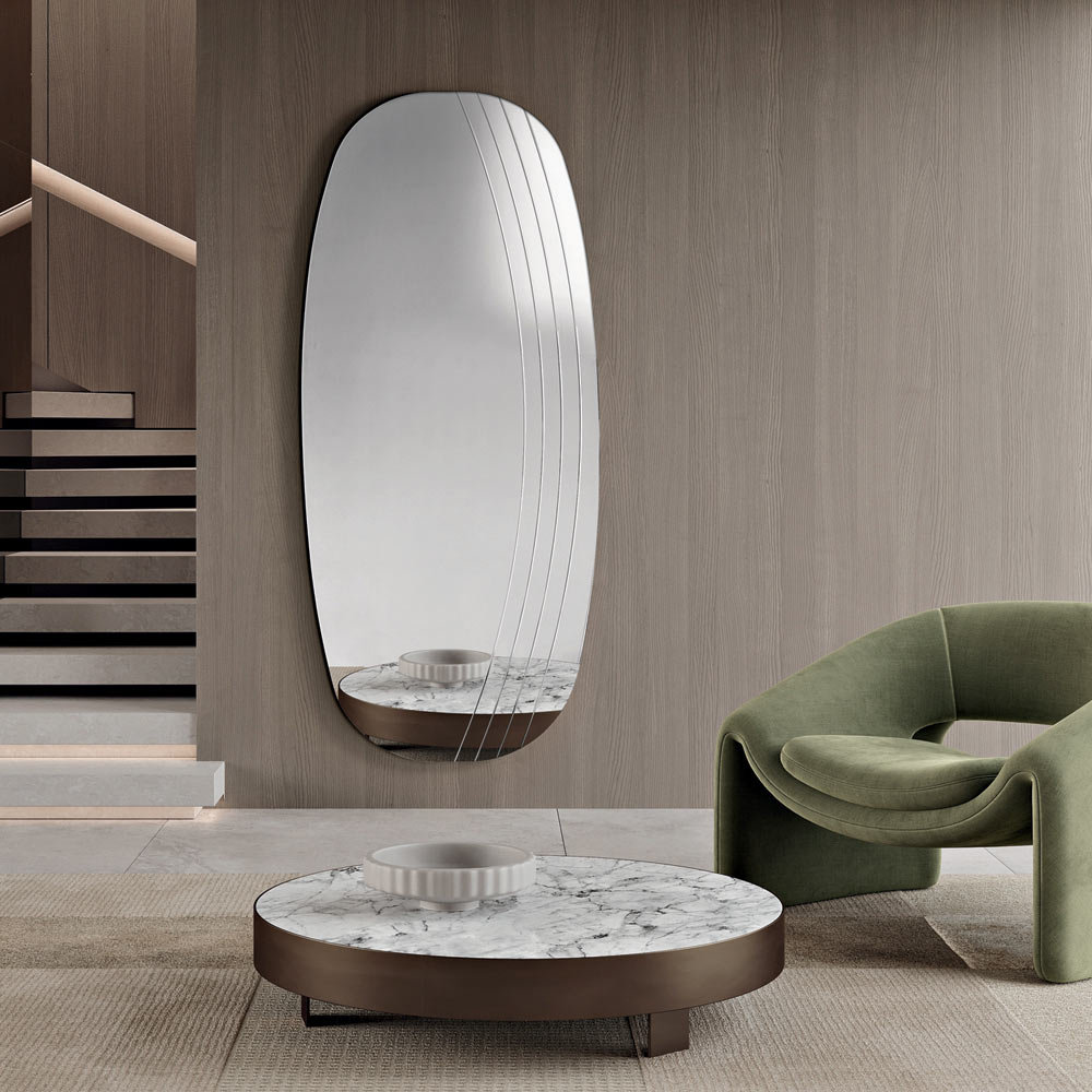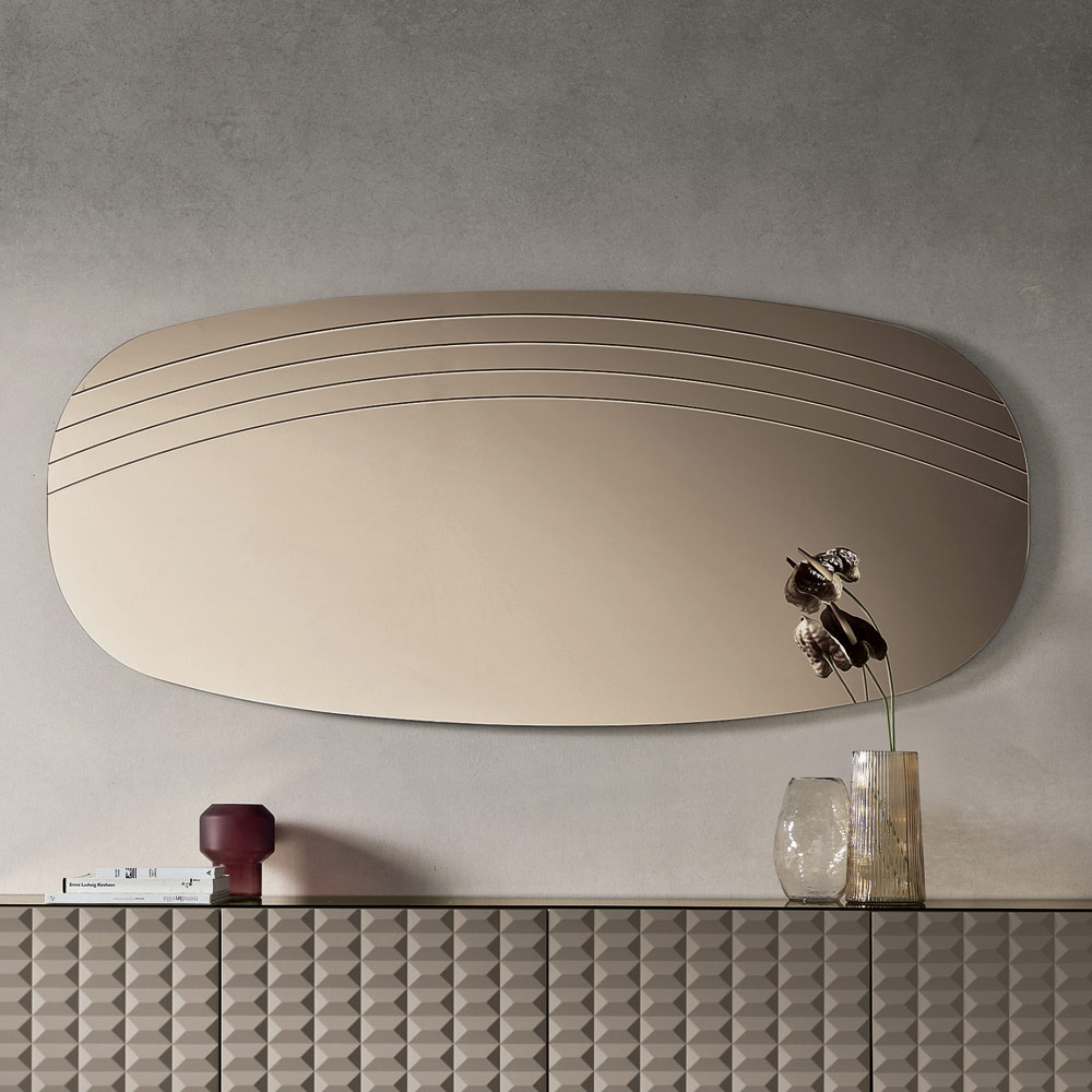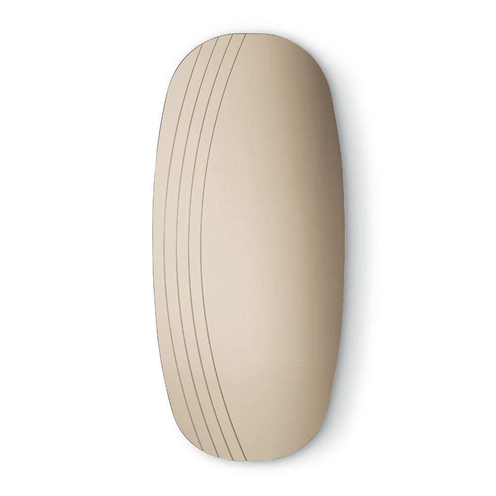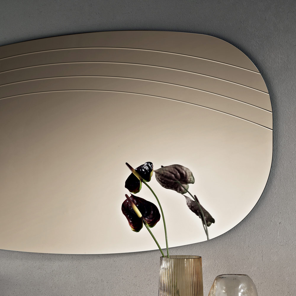 La surface réfléchissante est sublimée par de délicates incisions latérales qui épousent les courbes du miroir, créant un jeu subtil de lumière et de texture. Ce détail décoratif confère une profondeur visuelle et souligne l'harmonie des formes, donnant au miroir une allure sophistiquée et contemporaine.