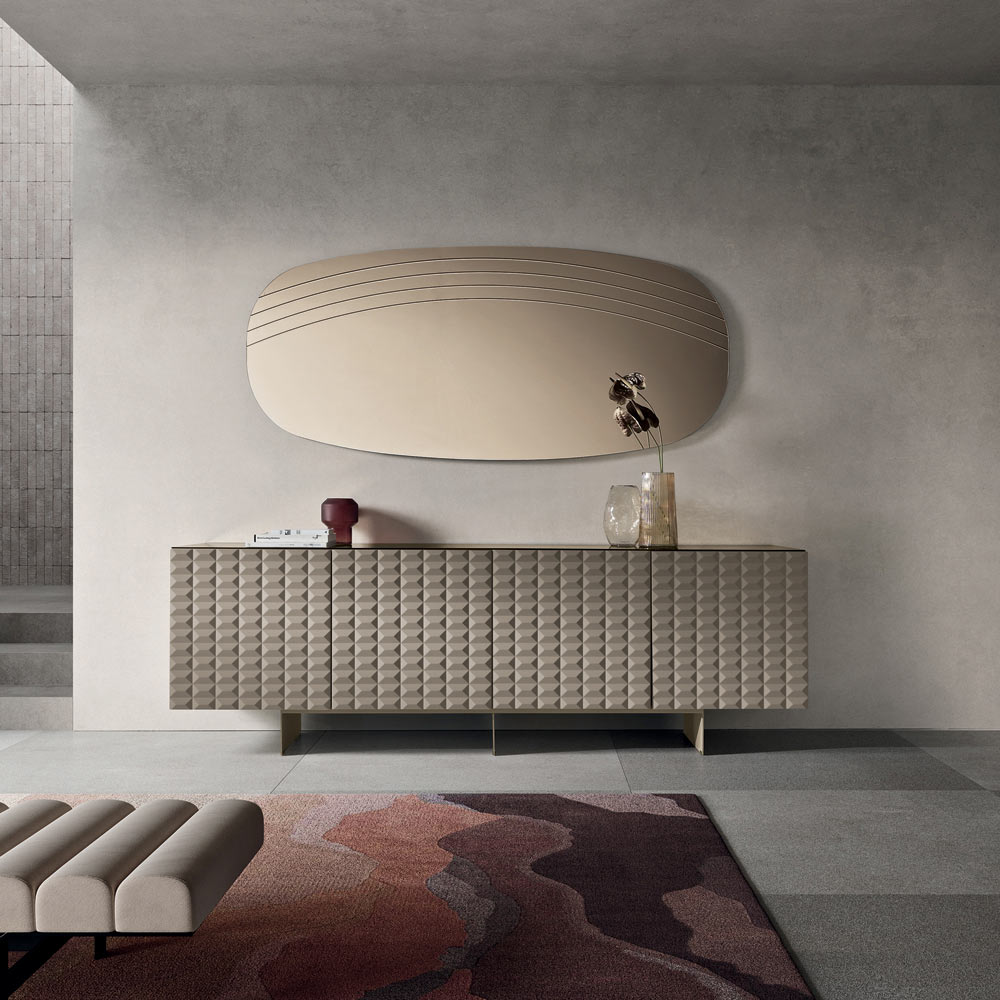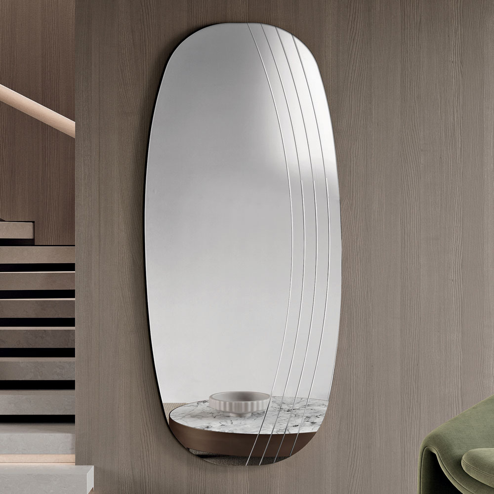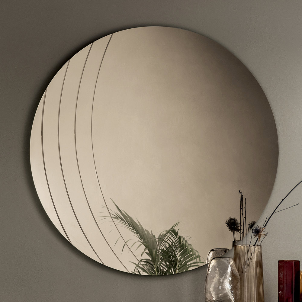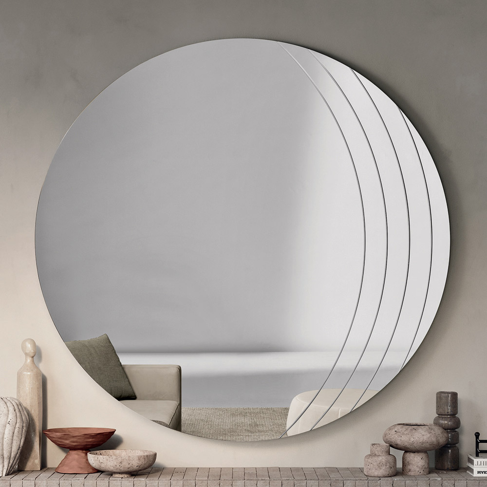La surface réfléchissante est sublimée par de délicates incisions latérales qui épousent les courbes du miroir, créant un jeu subtil de lumière et de texture. Ce détail décoratif confère une profondeur visuelle et souligne l'harmonie des formes, donnant au miroir une allure sophistiquée et contemporaine.