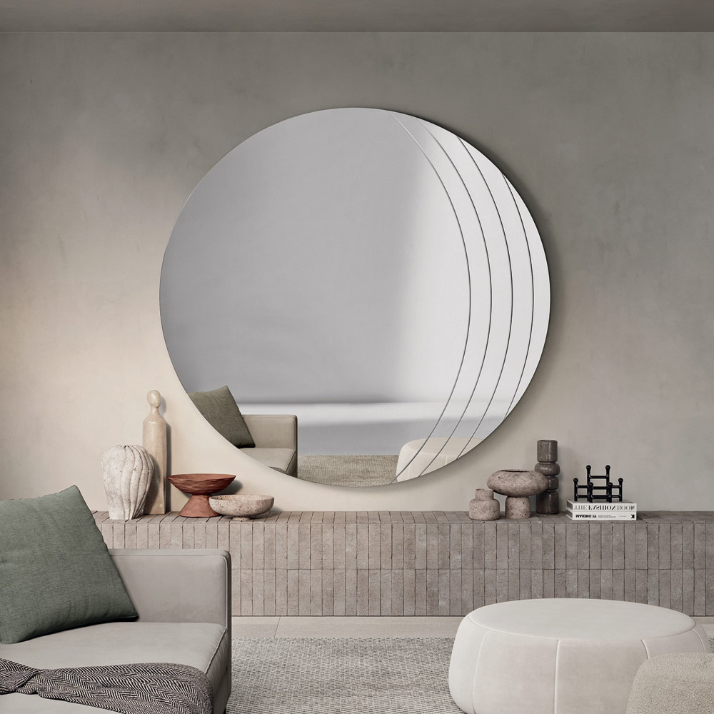Disponible en différentes tailles et formes — deux versions circulaires et une version rectangulaire aux coins arrondis —, le miroir s'adapte facilement à différents contextes d'ameublement, devenant un complément élégant aux espaces contemporains et sophistiqués.