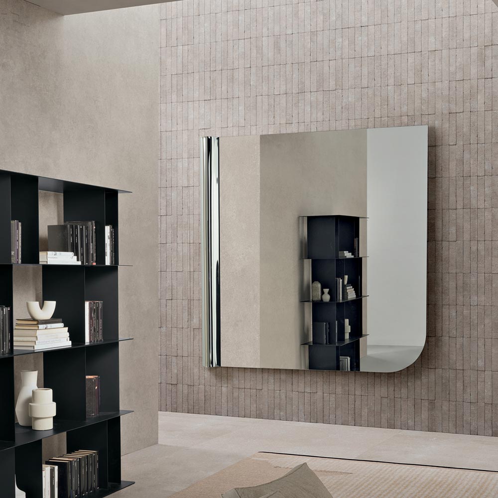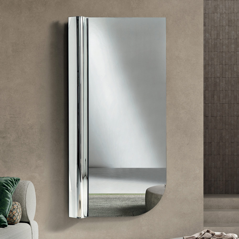 L'équilibre entre une douce asymétrie et des lignes essentielles fait de ce miroir un accessoire d'ameublement sophistiqué, capable d'enrichir le mur d'une signature graphique moderne et d'amplifier la luminosité de la pièce.