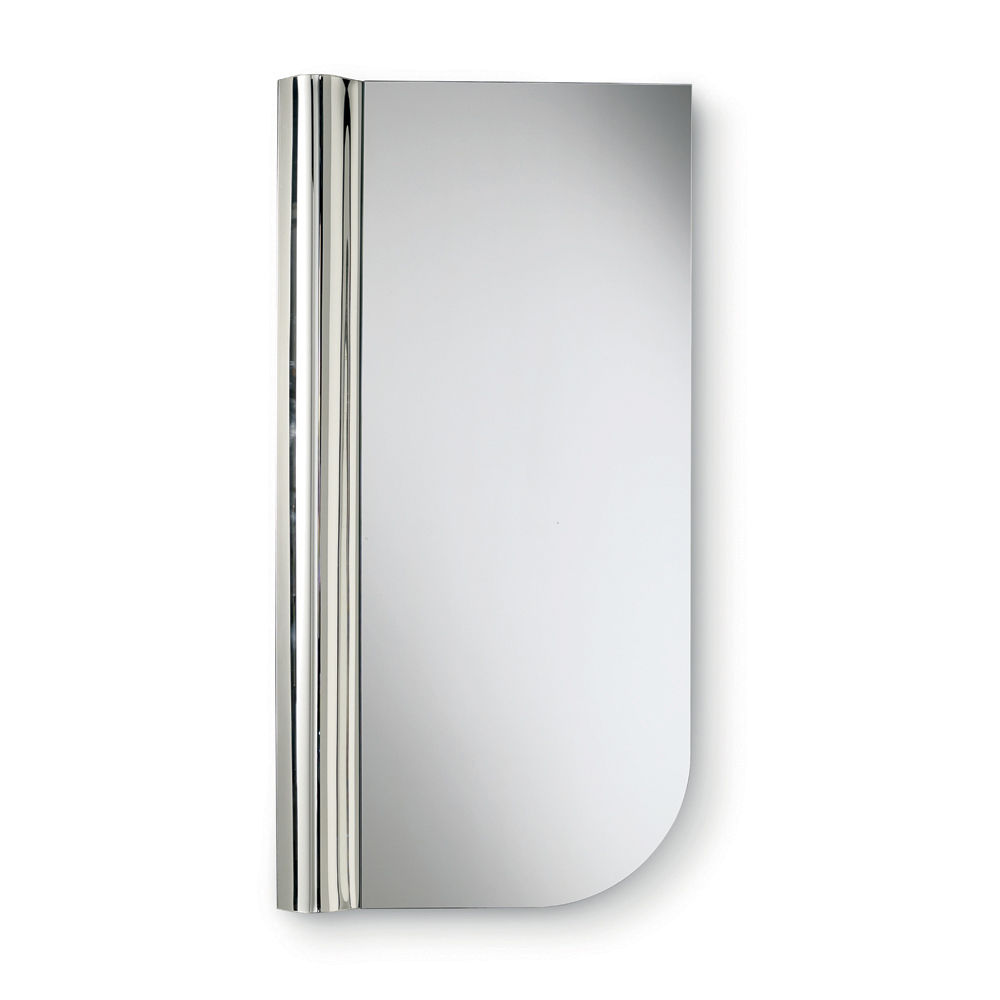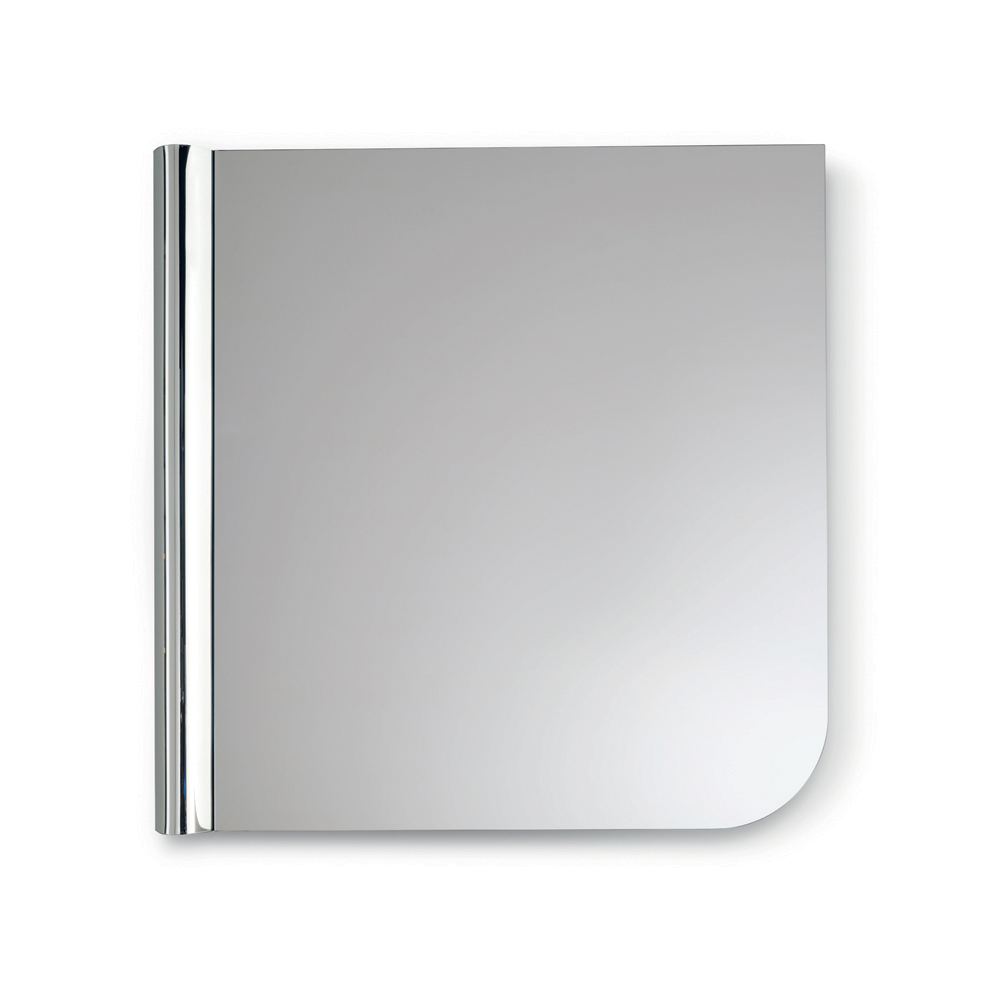 La forme du miroir se caractérise par des lignes épurées et un angle arrondi qui adoucit le profil du verre. Contrastant avec cette géométrie essentielle, une vague de verre en fusion court le long d'un côté vertical ; ce détail texturé dynamise la surface et crée un élégant jeu de lumière et de reflets.