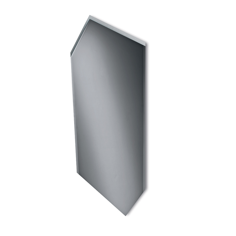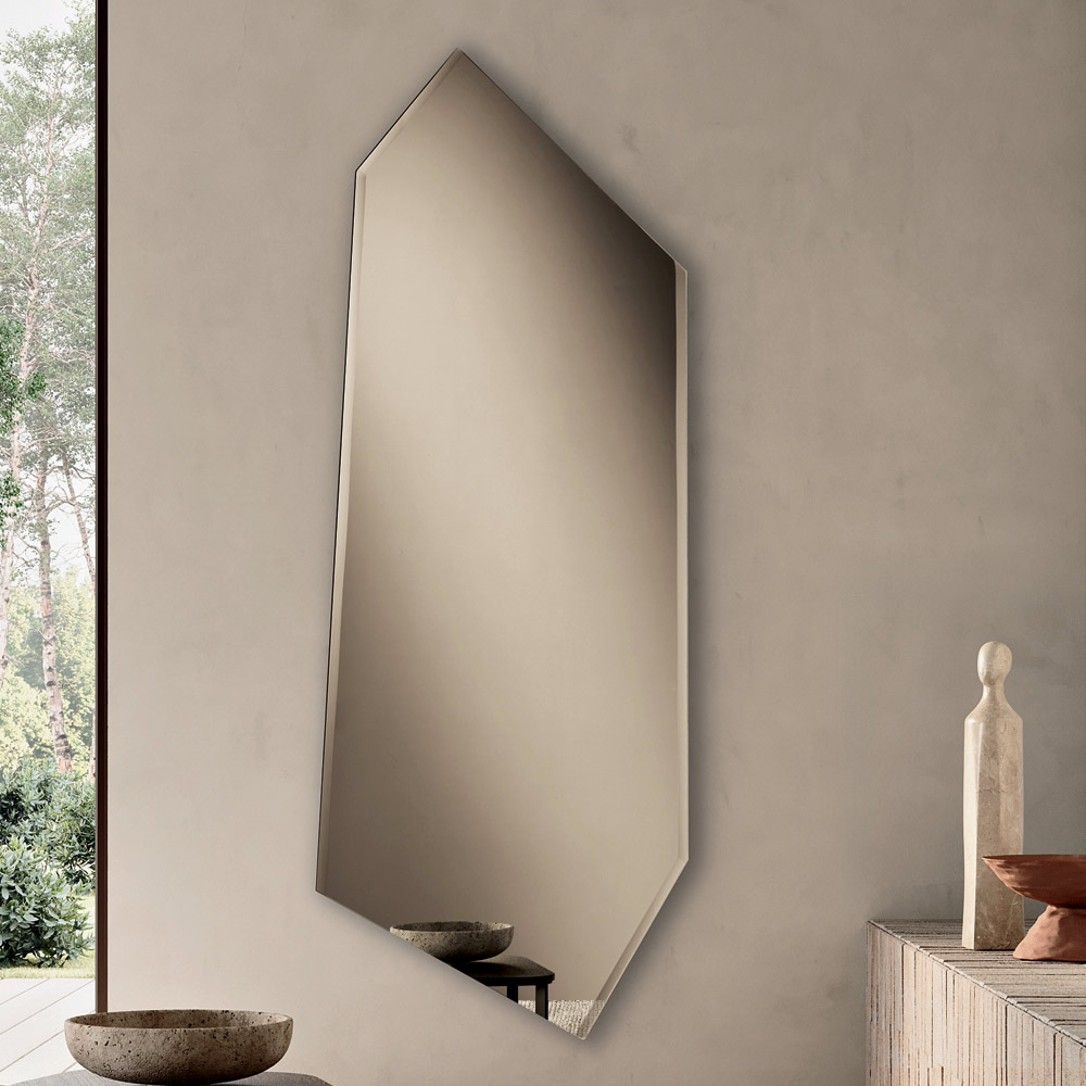 Le miroir présente une forme irrégulière évoquant un rectangle ouvert sur six côtés, créant une silhouette moderne et originale. Son profil est rehaussé d'un biseau partiel sur quatre côtés , un détail discret mais précieux qui souligne les contours et apporte de l'éclat à la surface réfléchissante.