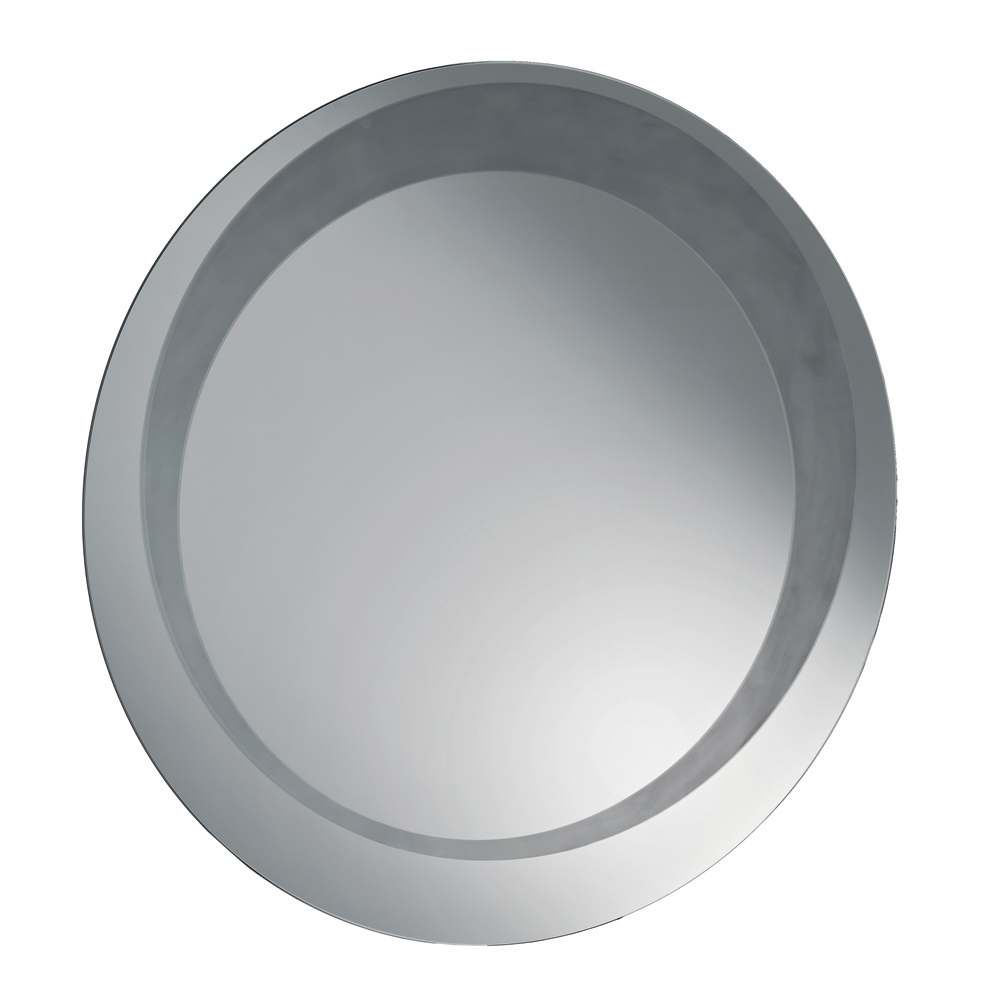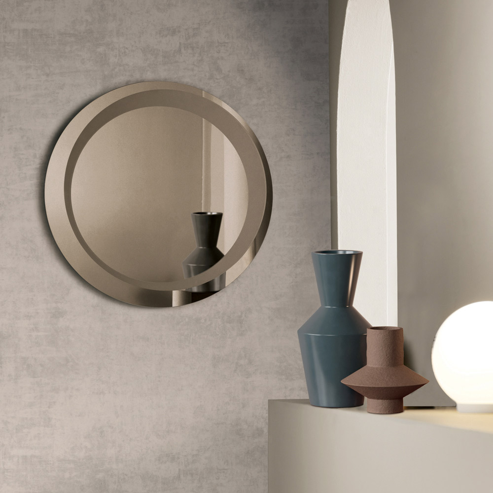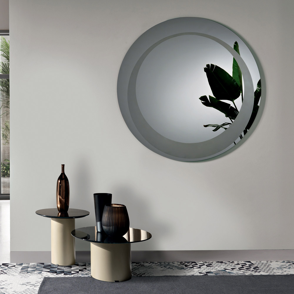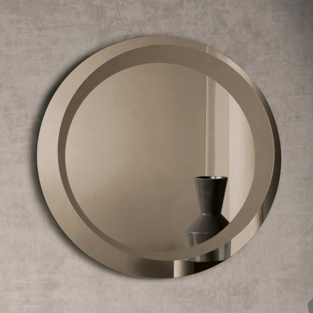 Le miroir rond est orné d'un décor sablé ton sur ton formant un cercle excentré d'épaisseur variable . Ce détail graphique crée un jeu raffiné de surfaces et de reflets, conférant profondeur et personnalité au design du miroir.