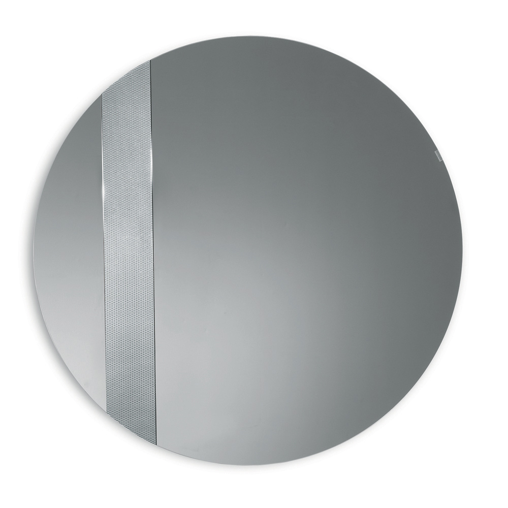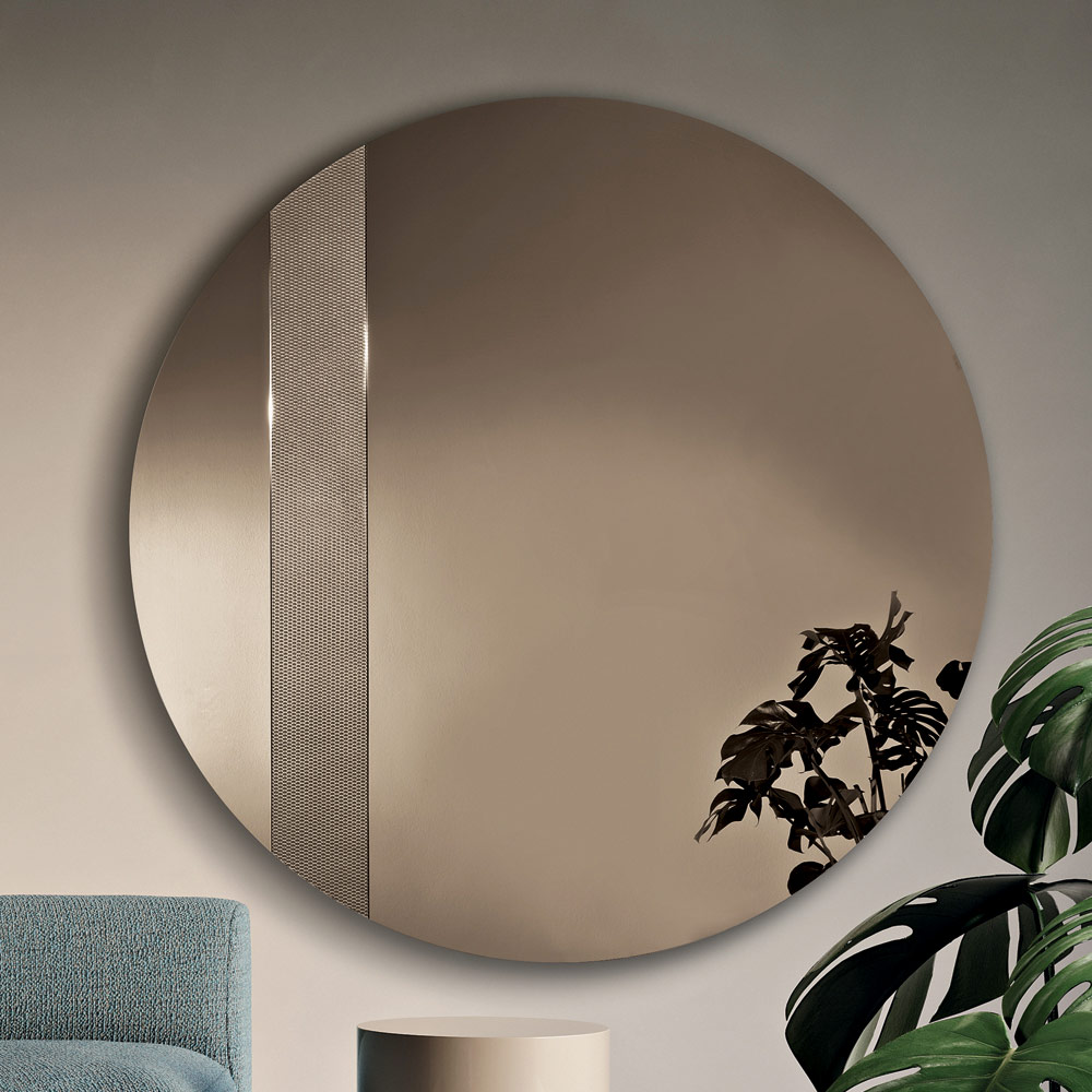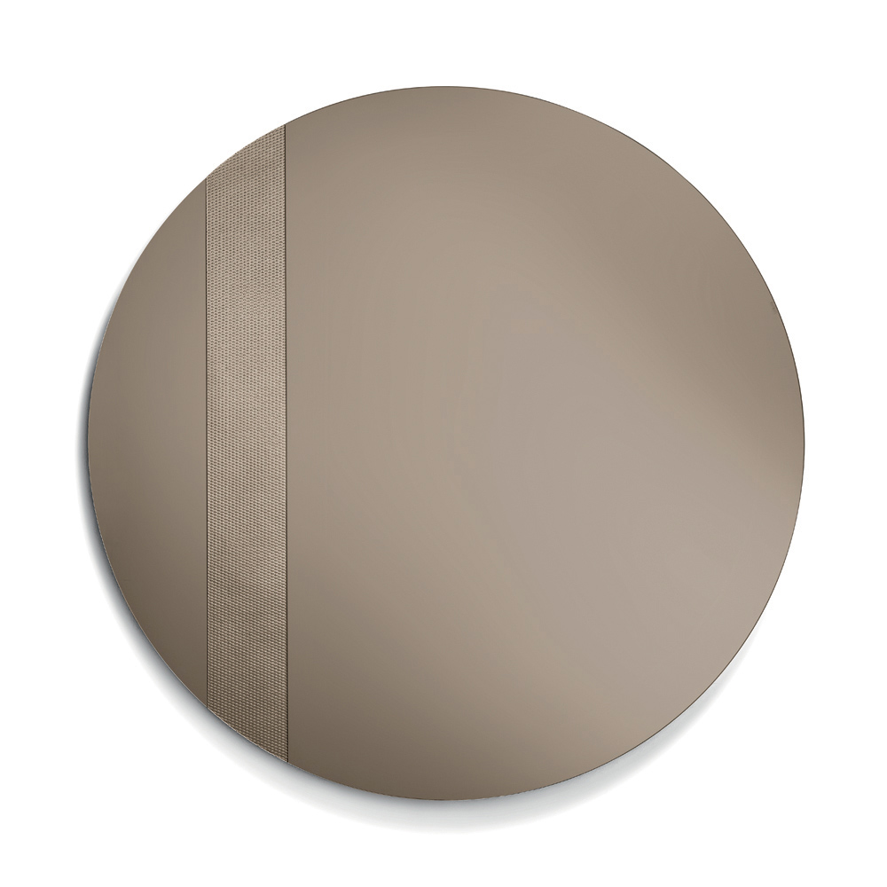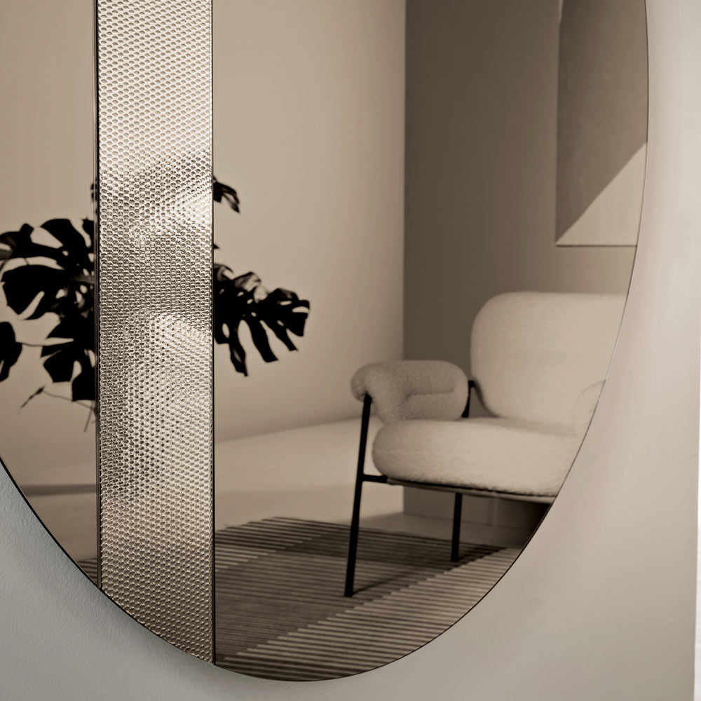 Ce miroir rond est orné d'un insert latéral en verre décoré d'un motif en maille ton sur ton . Ce détail graphique capte la lumière et crée un élégant jeu de reflets, conférant profondeur et mouvement à la surface réfléchissante.