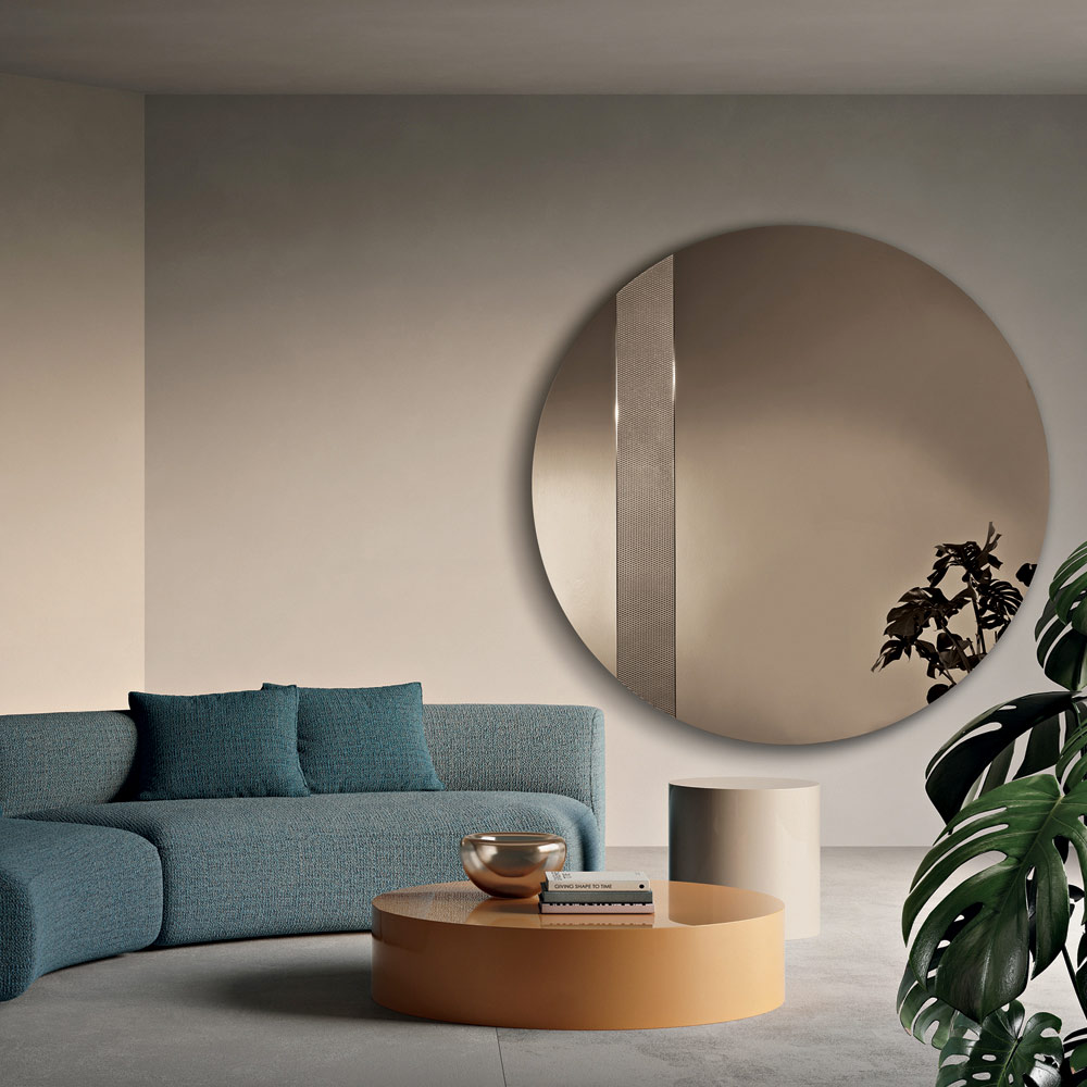 Grâce à l'alliance de lignes épurées et de textures décoratives , le miroir devient un accessoire d'ameublement moderne et sophistiqué, idéal pour les environnements contemporains où le mur devient l'élément central de l'espace.