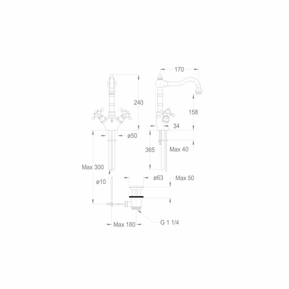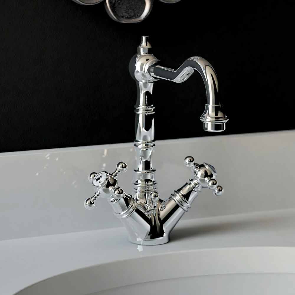 Mitigeur lavabo monotrou à poser au design classique en laiton chromé de 240 mm de hauteur et avec un entraxe de 170 mm avec drain et levier de relevage. Entièrement produit en Italie avec des matériaux de haute qualité conformes aux normes européennes. Ce mélangeur peut être installé sur le dessus, équipé d'un aérateur et d'une tête en céramique à 180 °; recommandé pour son système Energy Saving pour une économie d'eau de 6L / min, pour son bec orientable et pour ses raccords rigides.