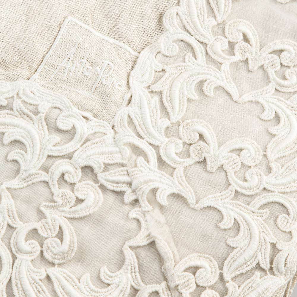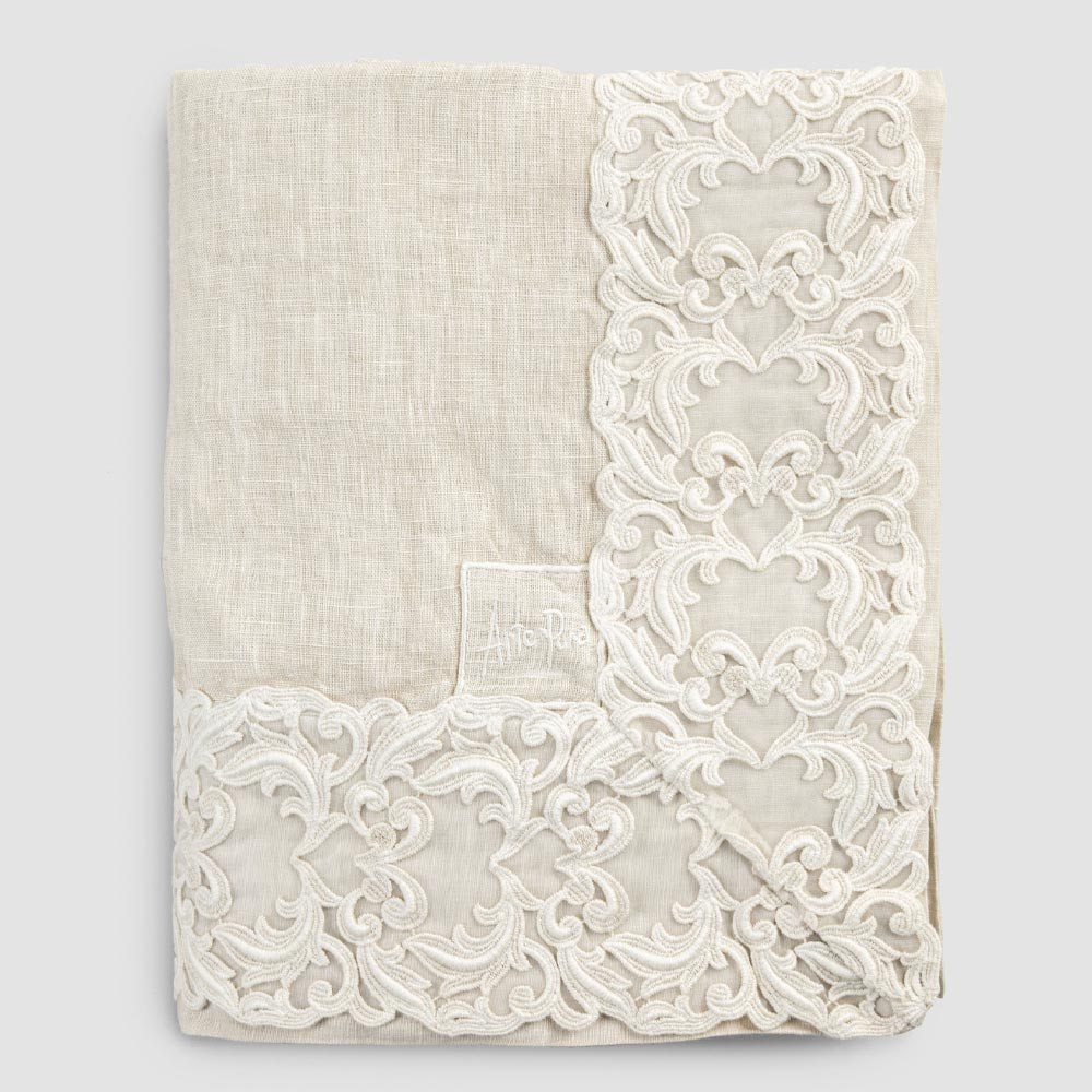 nappe rectangulaire en lin beige rosé agrémentée de dentelle Farnèse. Fabriqué en Italie avec des matériaux de haute qualité et rendu doux au toucher grâce à des traitements spéciaux qui améliorent l'aspect naturel. Idéal pour la table car il est apoallergénique et antibactérien, en plus de l'utilisation de