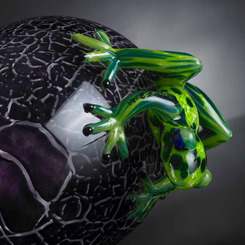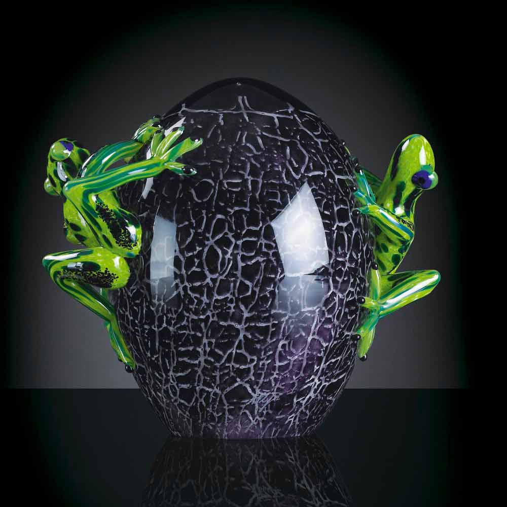 Statue décorative en forme de grenouilles sur un œuf en verre coloré Made in Italy.