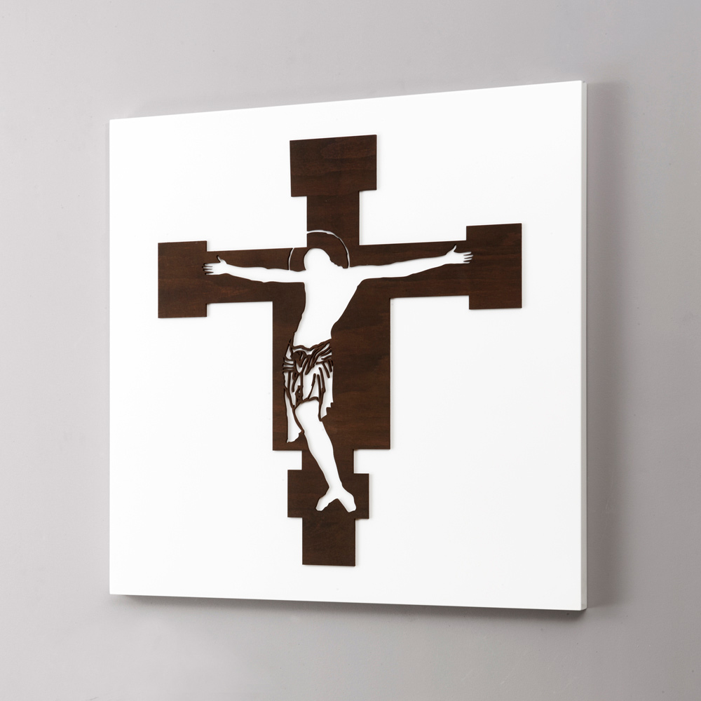 Cadre sacré en bois laqué blanc avec application d' un crucifix en bois wengé.