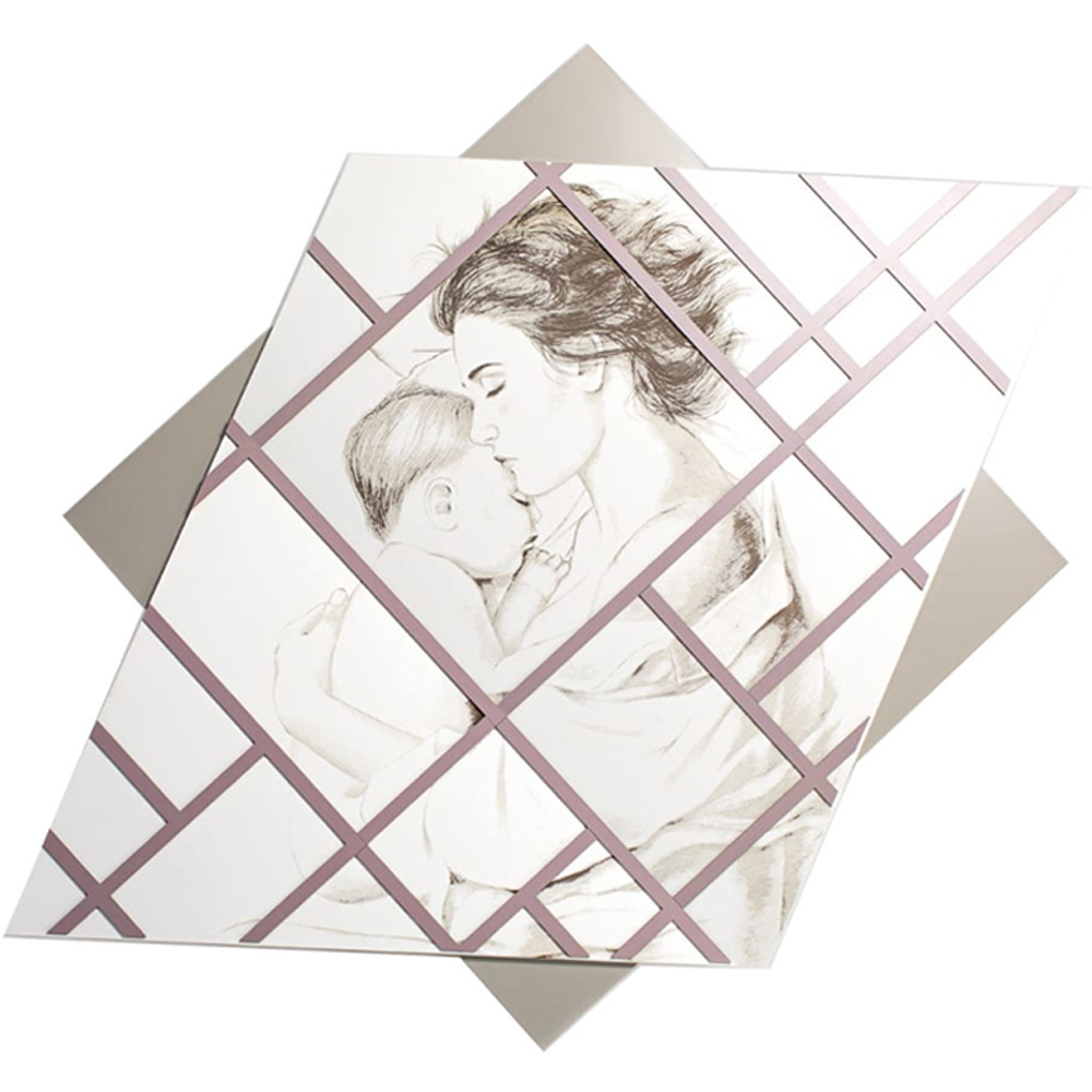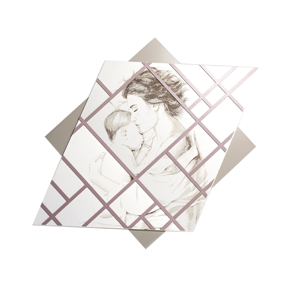 Une tête de lit représentant la maternité avec une étreinte entre la mère et l'enfant grâce au marquage au laser, qui montre les traits des visages. Panneau en bois laqué blanc mat avec marquage au laser, une technique spéciale qui crée un bas-relief sur les matériaux. Le panneau est gravé sur un panneau de couleur galet et est décoré au choix en velours ou rose cacao .