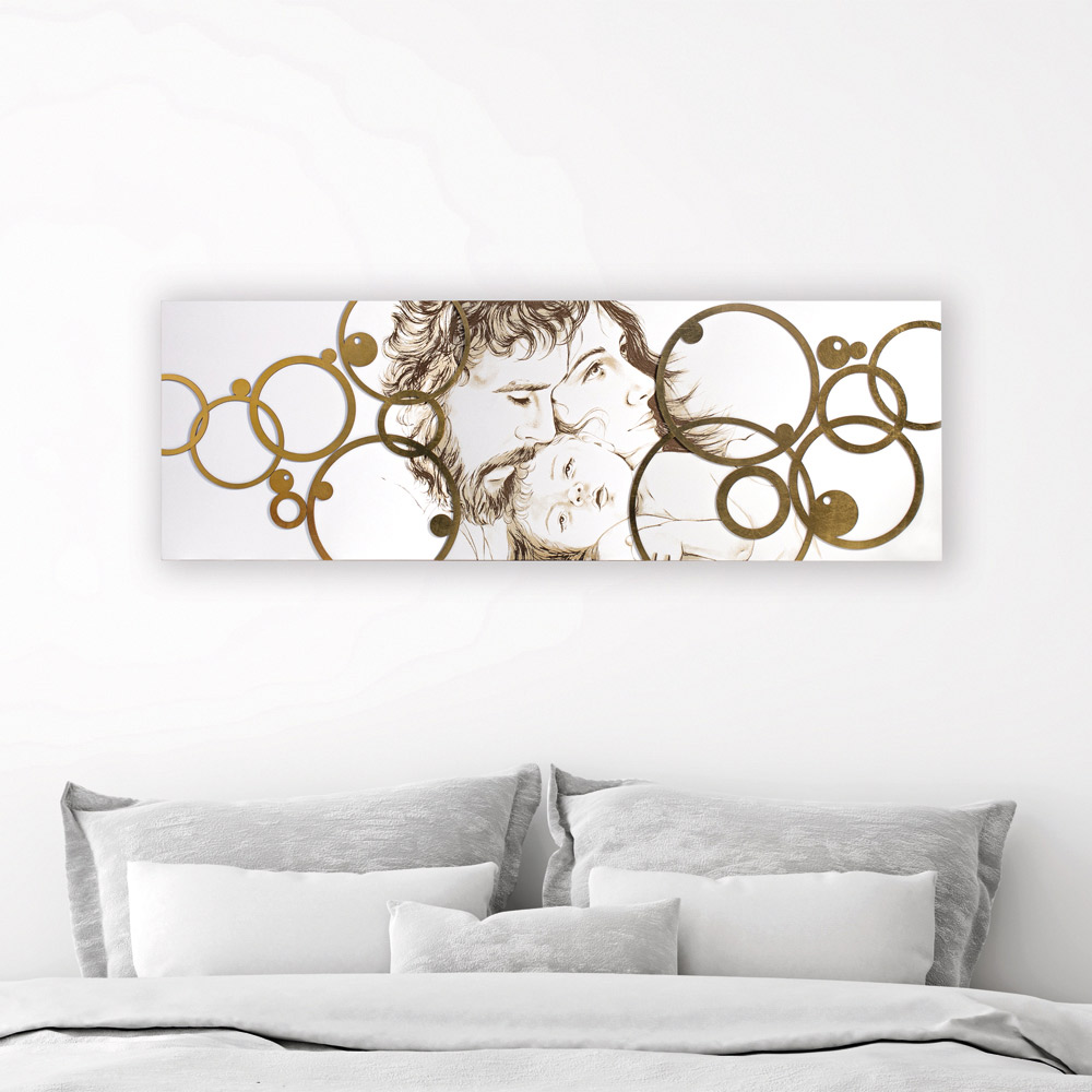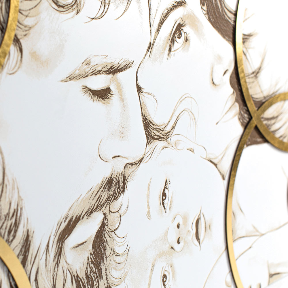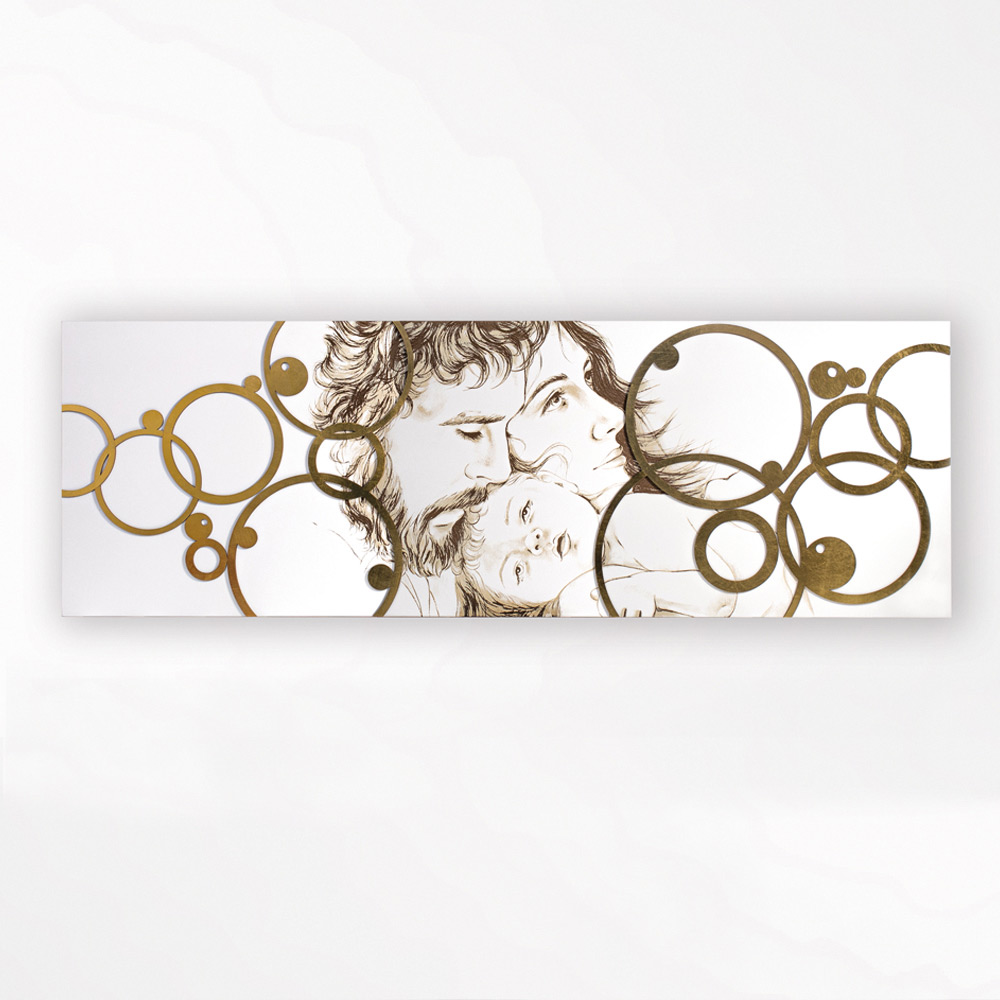 Le panel représente la Sainte Famille dans un style moderne . Des décorations à la feuille d'or sont appliquées sur le motif marqué au laser. Panneau en bois laqué blanc mat avec marquage au laser, une technique spéciale qui crée un bas-relief sur les matériaux. Les applications sont réalisées en feuille d'or , une technique précieuse spéciale.