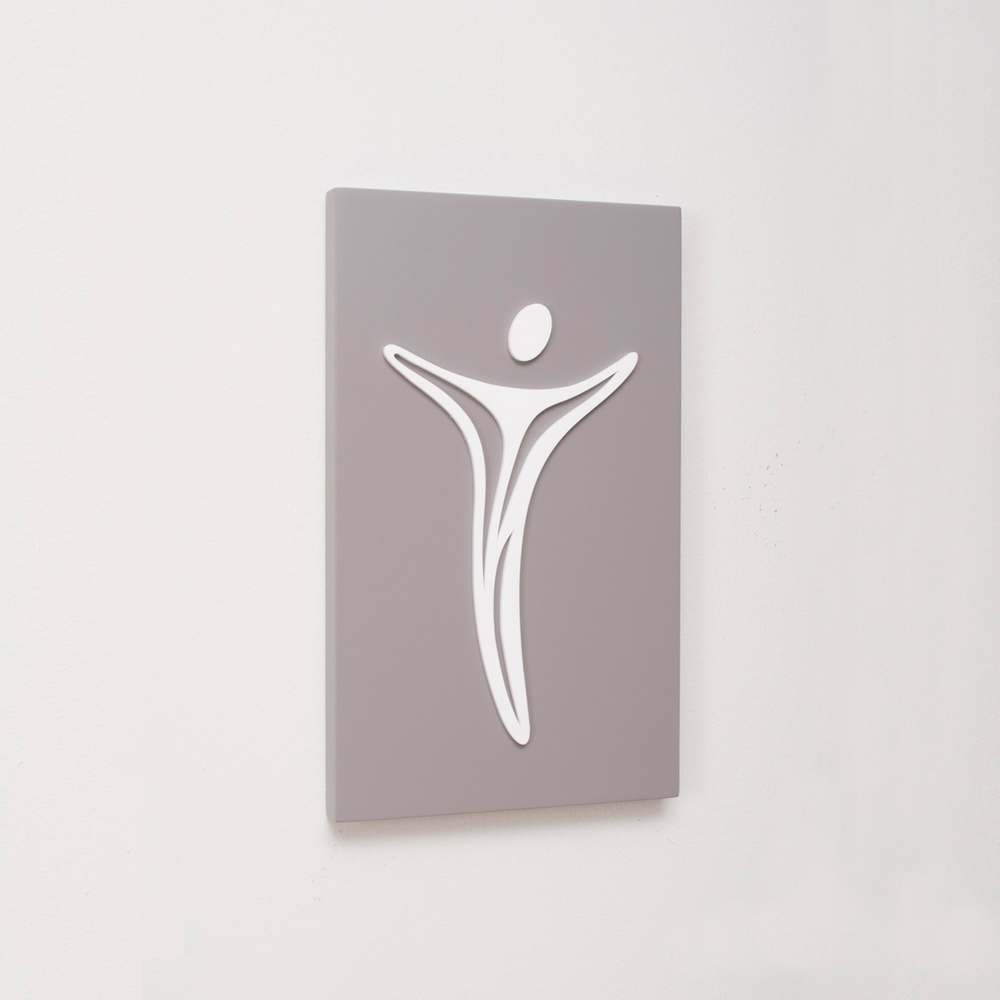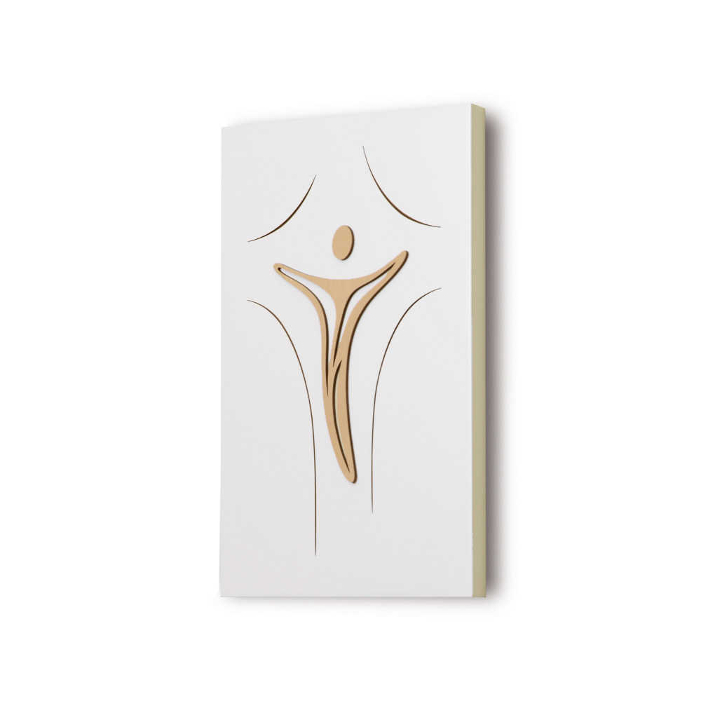 Image/Crucifix avec socle en bois laqué et application . " Virgules " gravées au laser . Trou pour l'accrocher au mur.