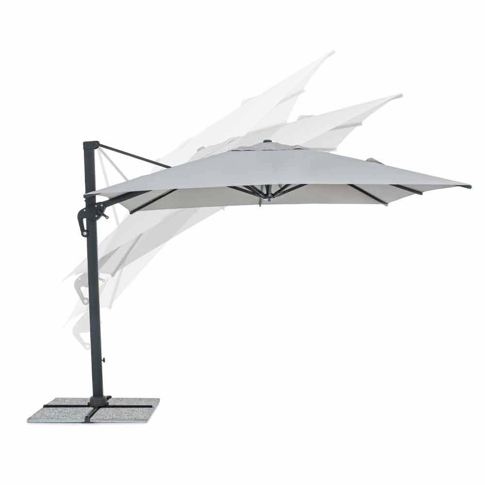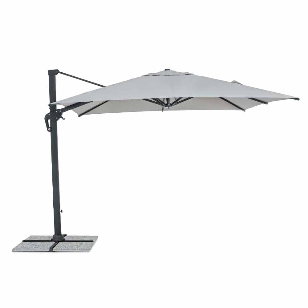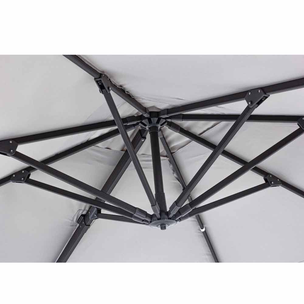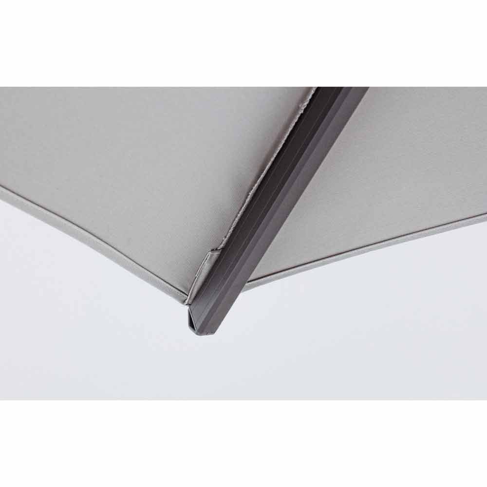 Structure en aluminium enduit de poudre (polyester). Poteau 93x57mm. 8 nervures 28x18mm. Tissu polyester gris clair 250gr / m2 avec enduction PA (polyamide). Piétement croisé en acier . Poteau rotatif à 360 ° avec pédale. Inclinaison verticale avec poignée à 5 positions. Y compris la housse de parapluie.