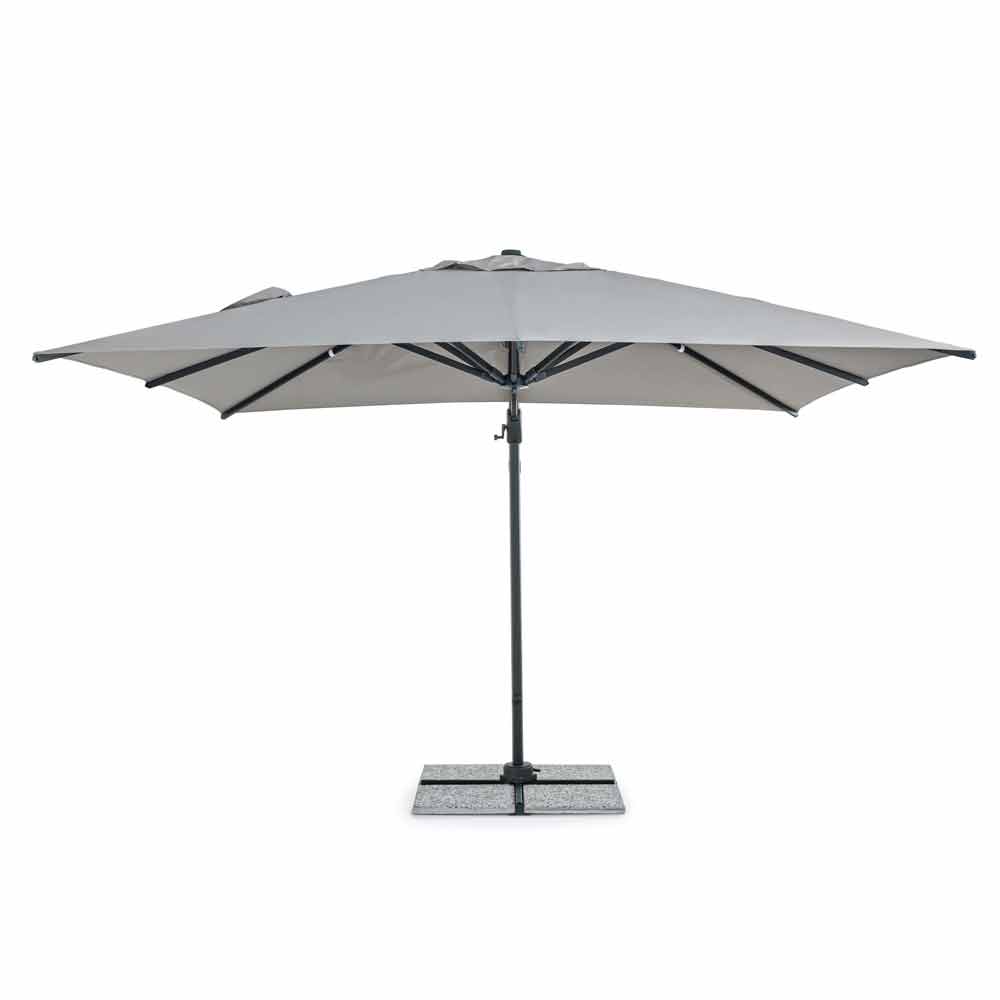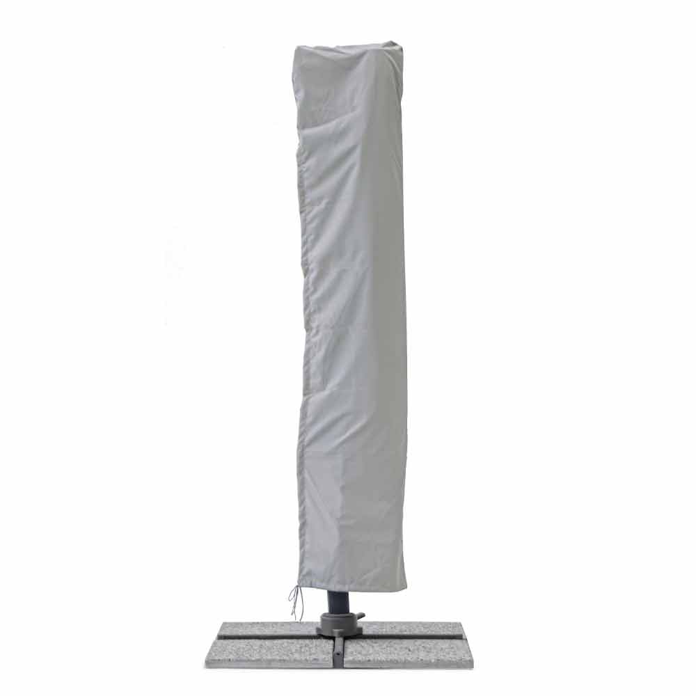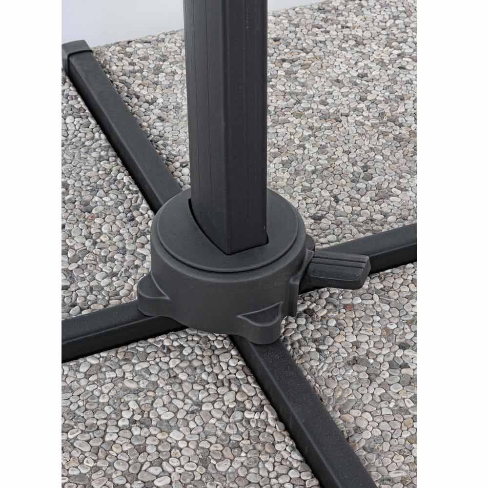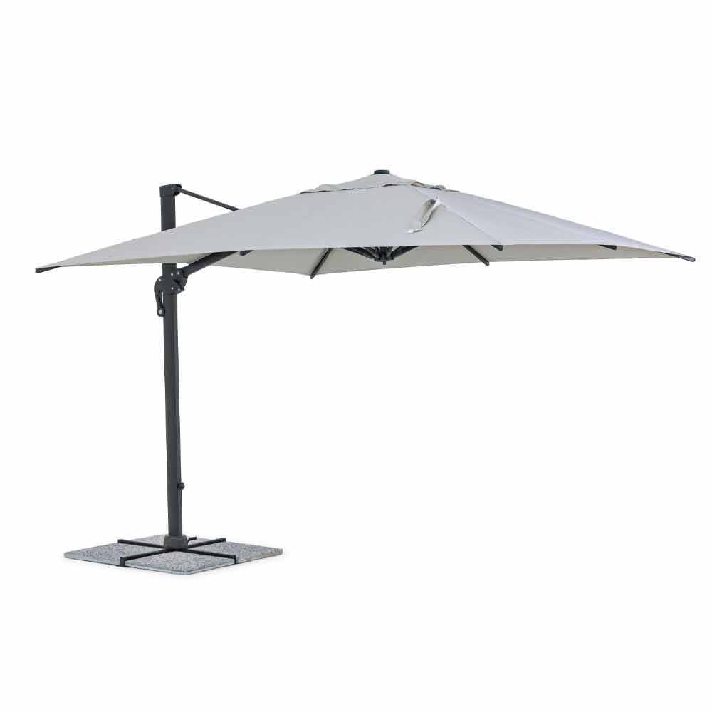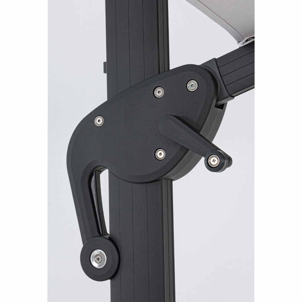 Structure en aluminium enduit de poudre (polyester). Poteau 93x57mm. 8 nervures 28x18mm. Tissu polyester gris clair 250gr / m2 avec enduction PA (polyamide). Piétement croisé en acier . Poteau rotatif à 360 ° avec pédale. Inclinaison verticale avec poignée à 5 positions. Y compris la housse de parapluie.