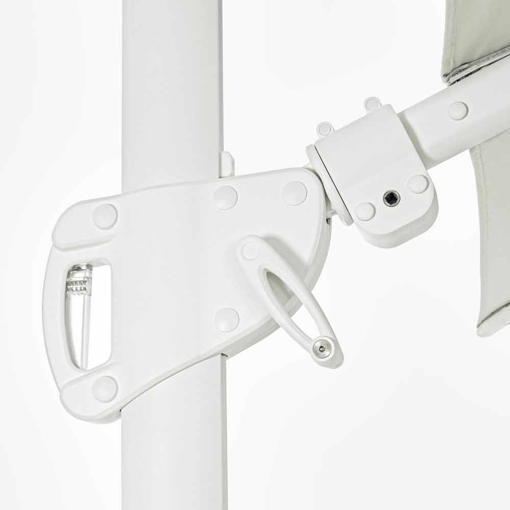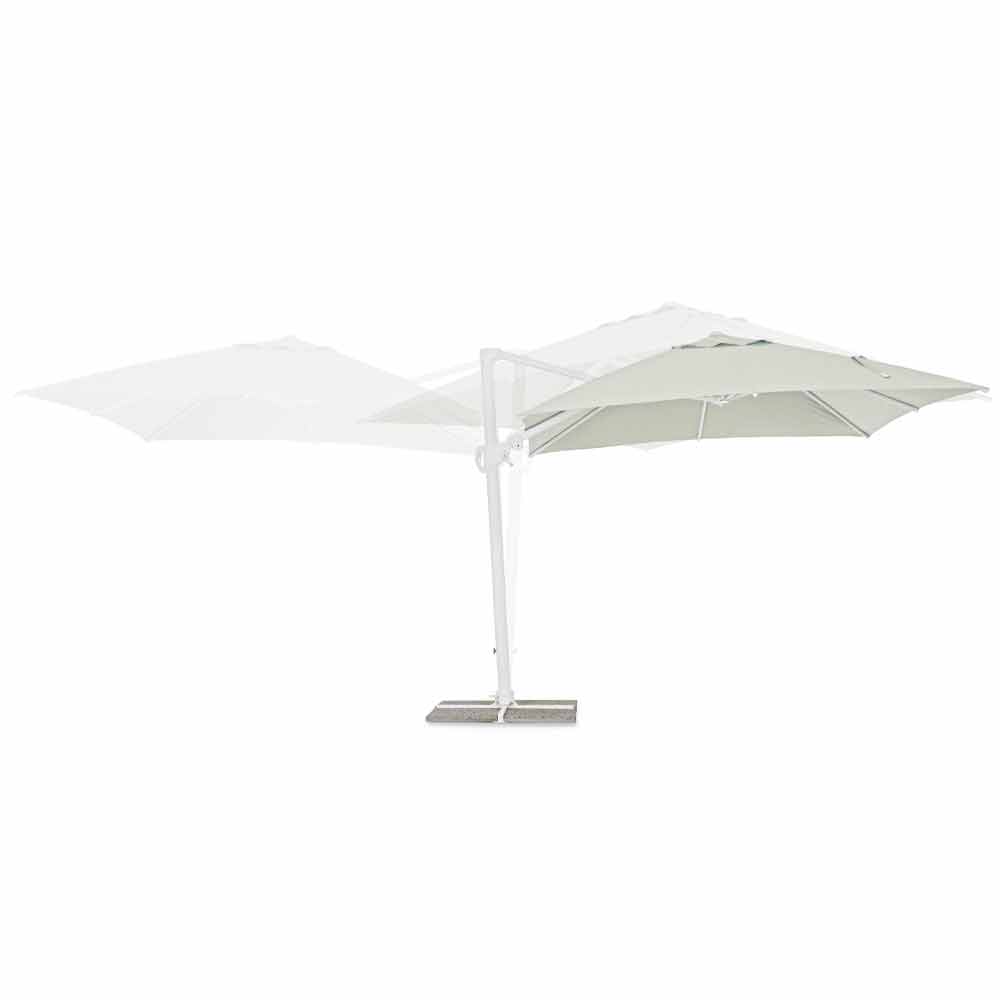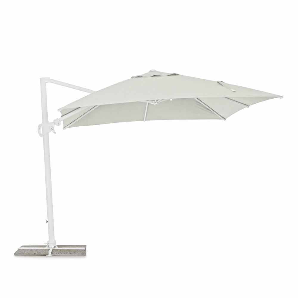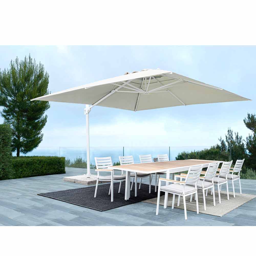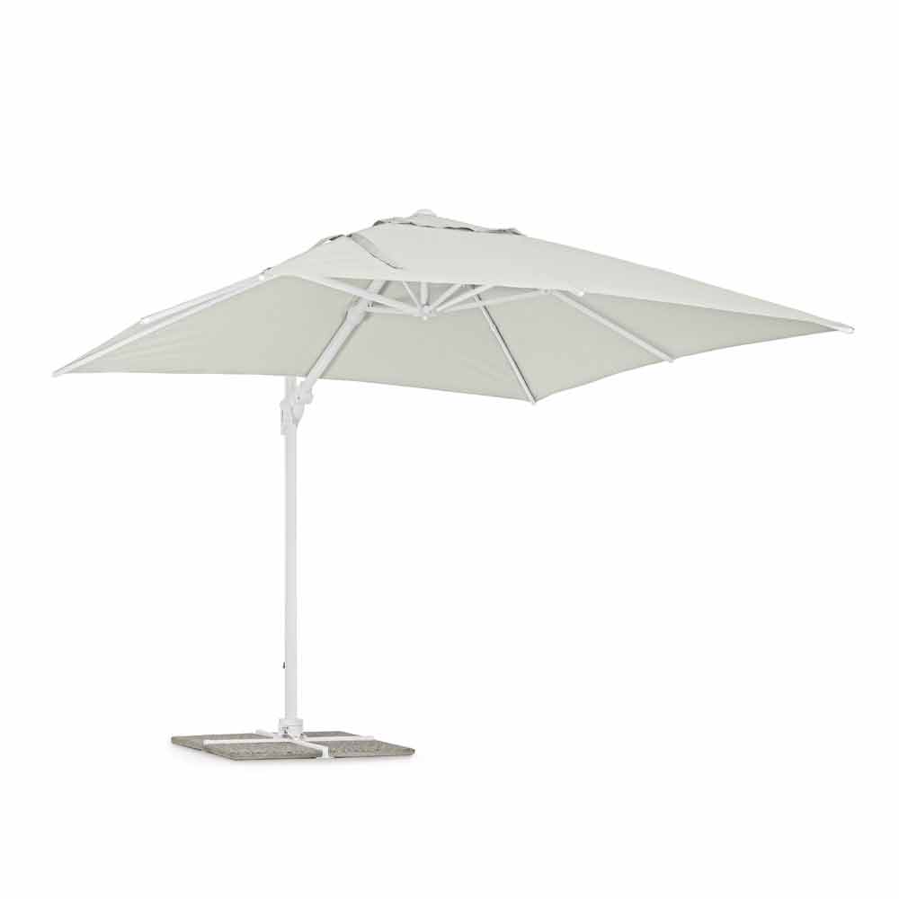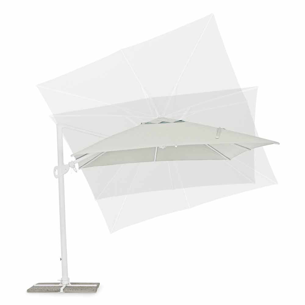 Structure en aluminium enduit de poudre (polyester). Mât 90x60mm, 8 nervures 25x17mm, tissu polyester naturel 250gr / m2 avec revêtement PA (polyamide), base en acier, mât rotatif 360 ° avec pédale. Inclinaison verticale avec poignée à 6 positions, équipée d'un système d'inclinaison droite-gauche pour parapluie. Y compris la housse de parapluie. Tuiles non incluses .