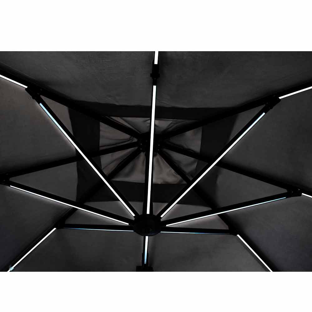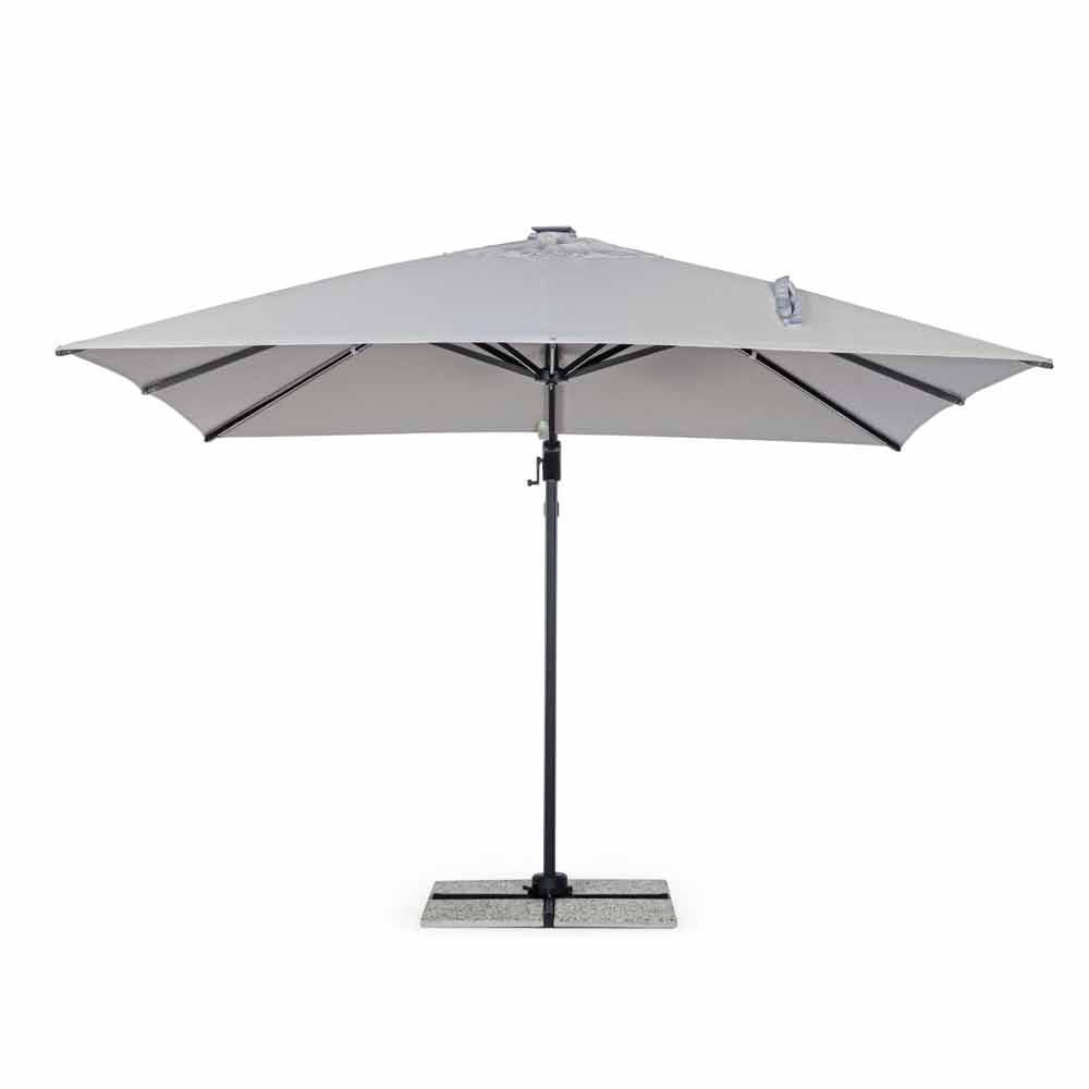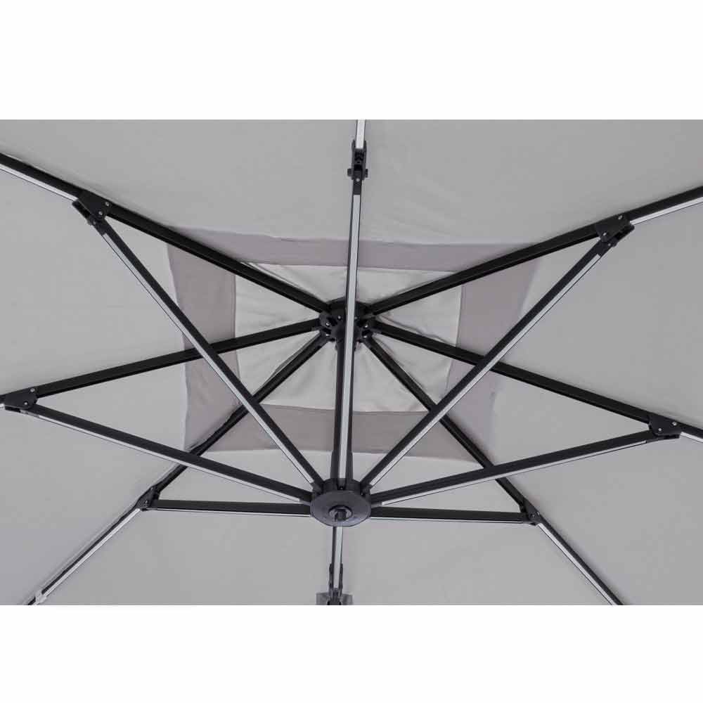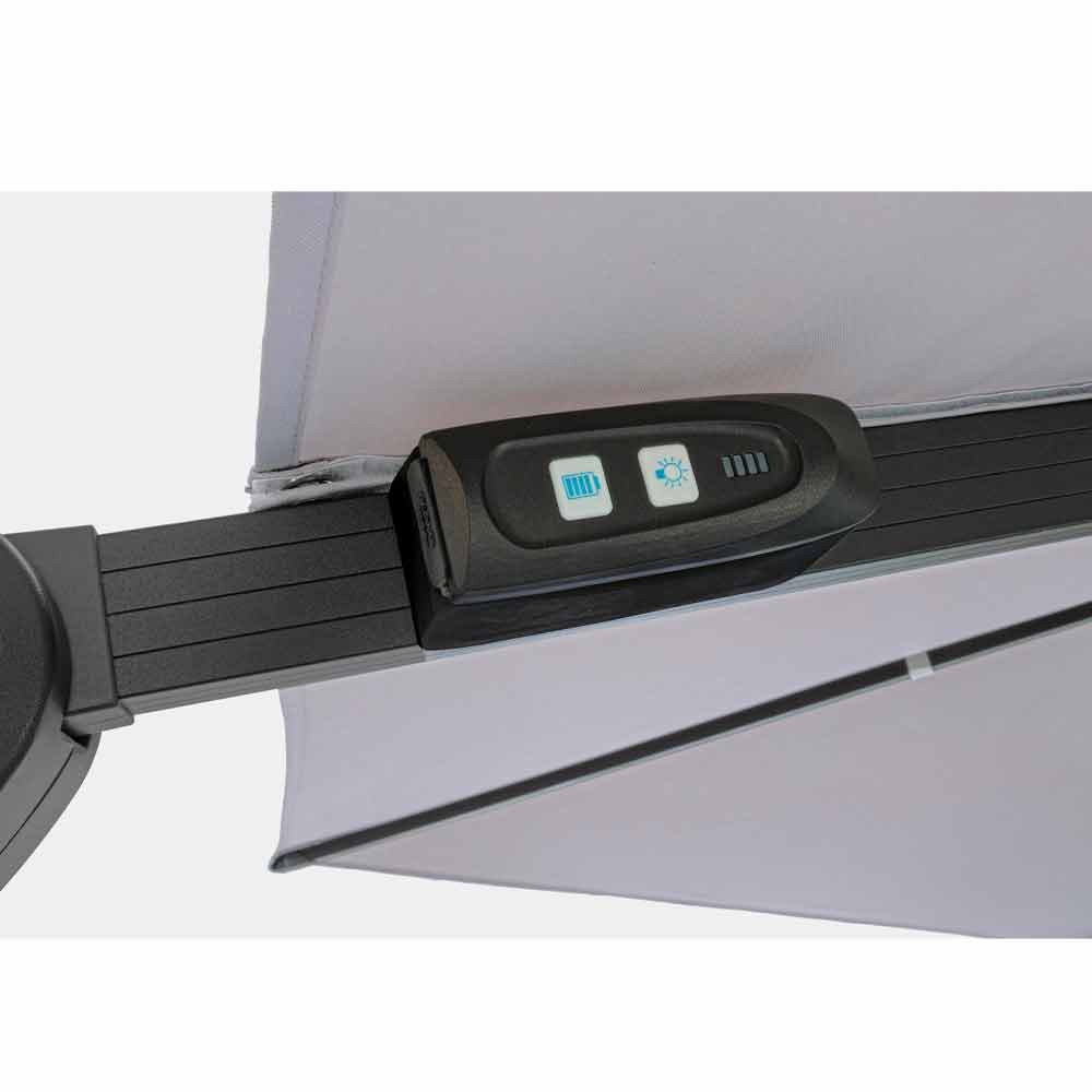 Structure en aluminium enduit de poudre (polyester). Poteau 77x53mm, 8 nervures 24x14mm avec lumières led blanches rechargeables avec panneau solaire inclus. Tissu polyester gris clair 250gr / m2 avec enduction PA (polyamide). Piétement croisé en acier . Poteau rotatif à 360 ° avec pédale. Inclinaison verticale avec poignée à 4 positions. Y compris la housse de parapluie.