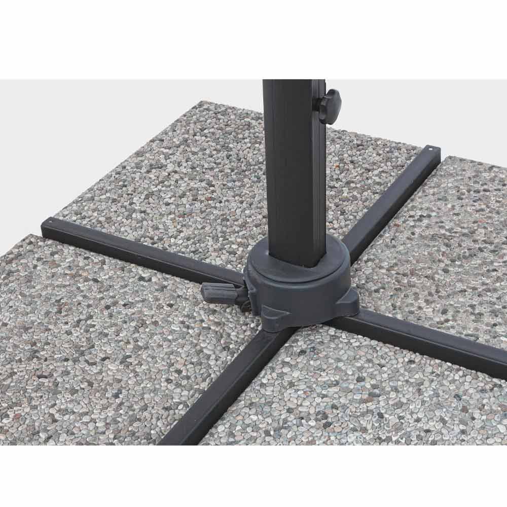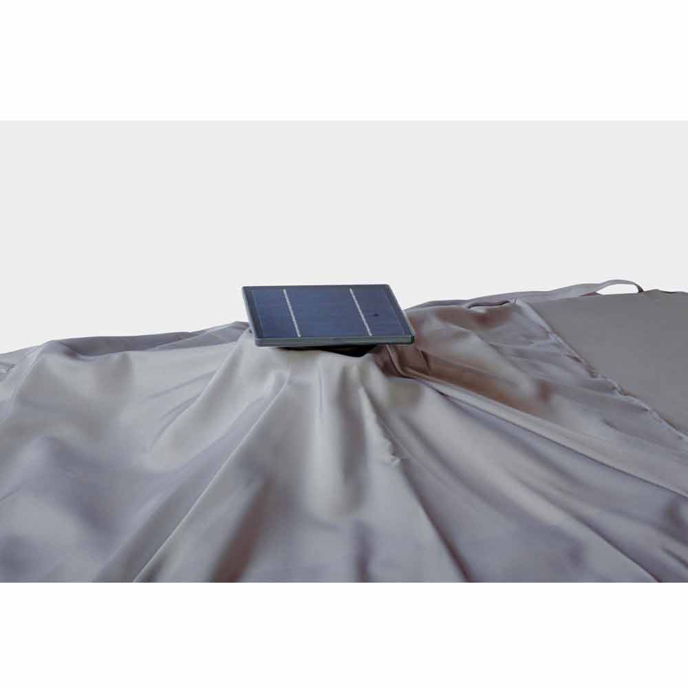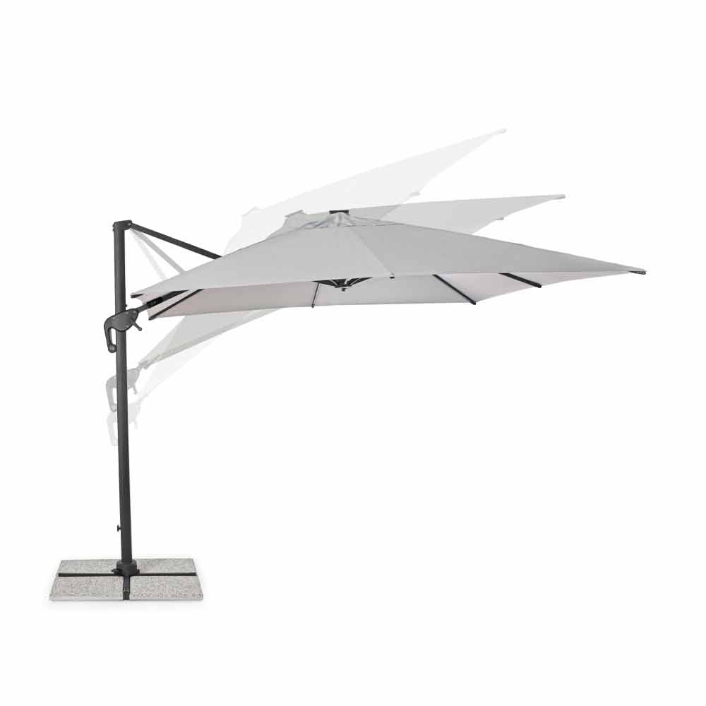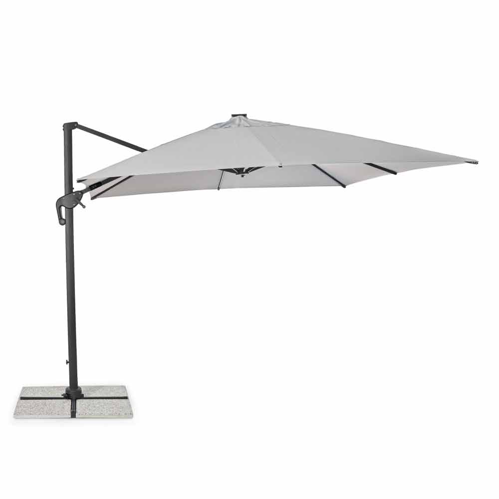Structure en aluminium enduit de poudre (polyester). Poteau 77x53mm, 8 nervures 24x14mm avec lumières led blanches rechargeables avec panneau solaire inclus. Tissu polyester gris clair 250gr / m2 avec enduction PA (polyamide). Piétement croisé en acier . Poteau rotatif à 360 ° avec pédale. Inclinaison verticale avec poignée à 4 positions. Y compris la housse de parapluie.