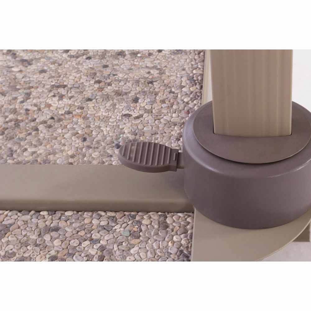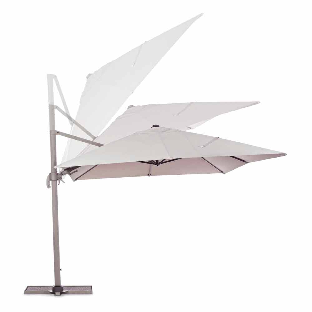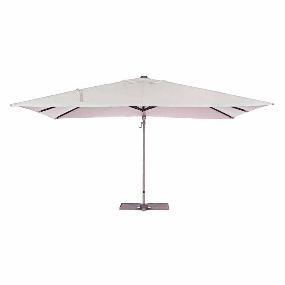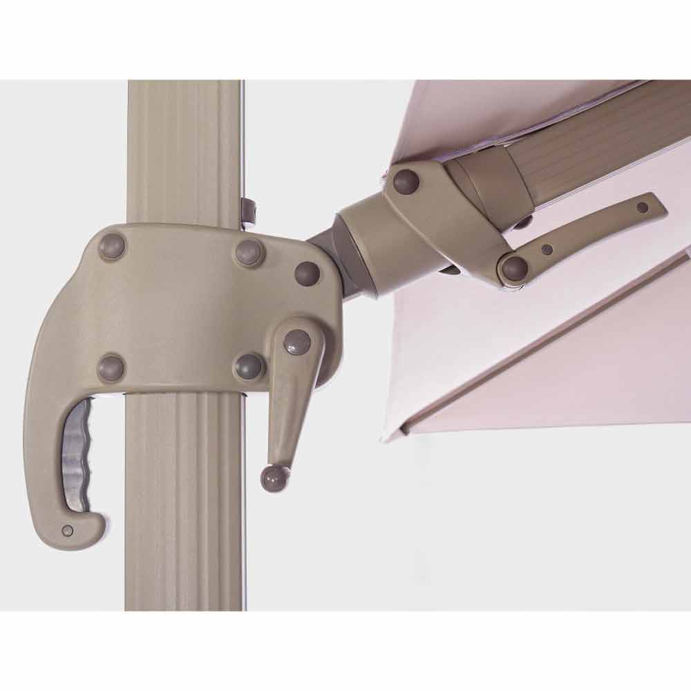 Structure en aluminium enduit de poudre (polyester). Poteau 57x93x2mm, 8 nervures 25x17x1mm. Housse polyester couleur sable 250gr / m2 avec enduction PA (polyamide). Base latérale en acier . Poteau rotatif à 360 ° manuellement. Inclinaison verticale avec poignée à 5 positions. Équipé d'une poignée pour l'inclinaison droite-gauche du parapluie.