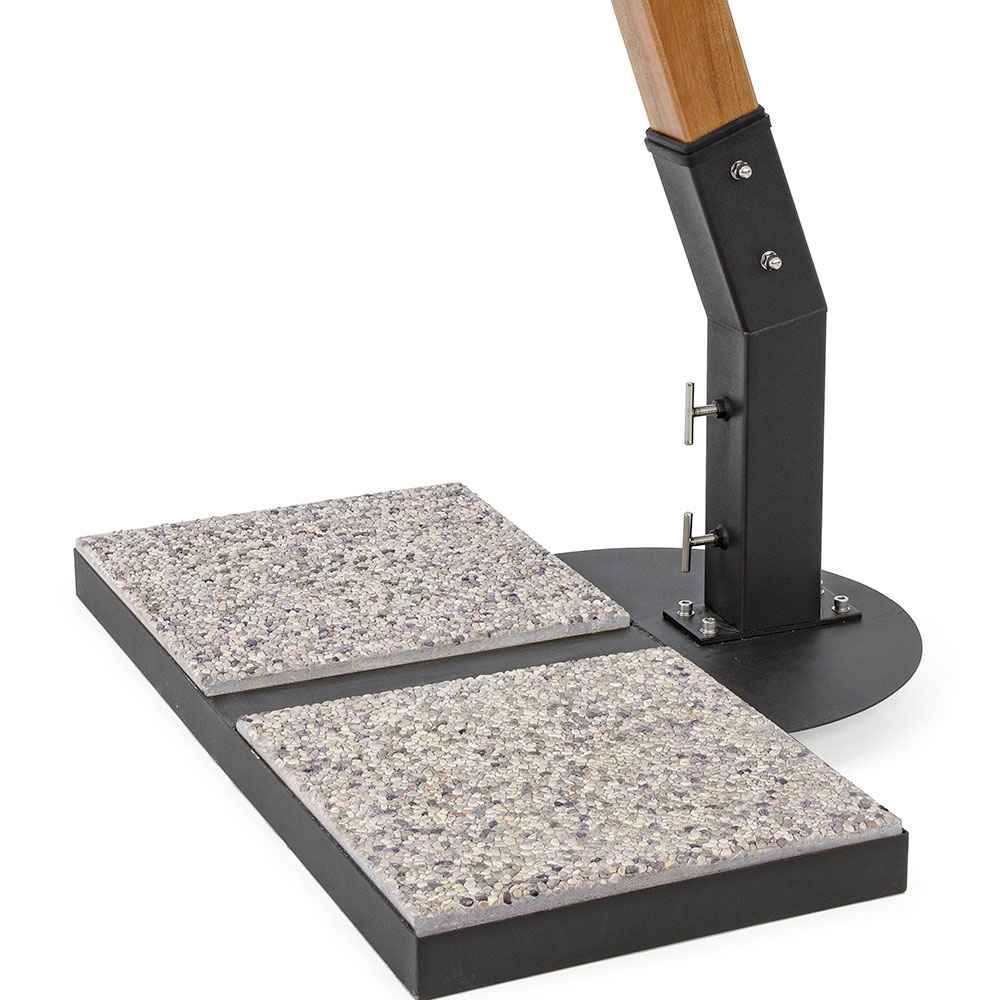 Structure en bois avec vernis teck à base de nitrocellulose. Mât de 93x93 mm, 8 nervures de 20x35 mm avec extrémités en aluminium et inserts en cuir. Couronne en bois. Base latérale en acier. Poteau rotatif à 180 ° manuellement. Tissu polyester 270 gr / m2 de couleur écru avec enduction PA (polyamide). Tuiles non incluses . L'utilisation d'au moins 4 carreaux (100KG) est recommandée.