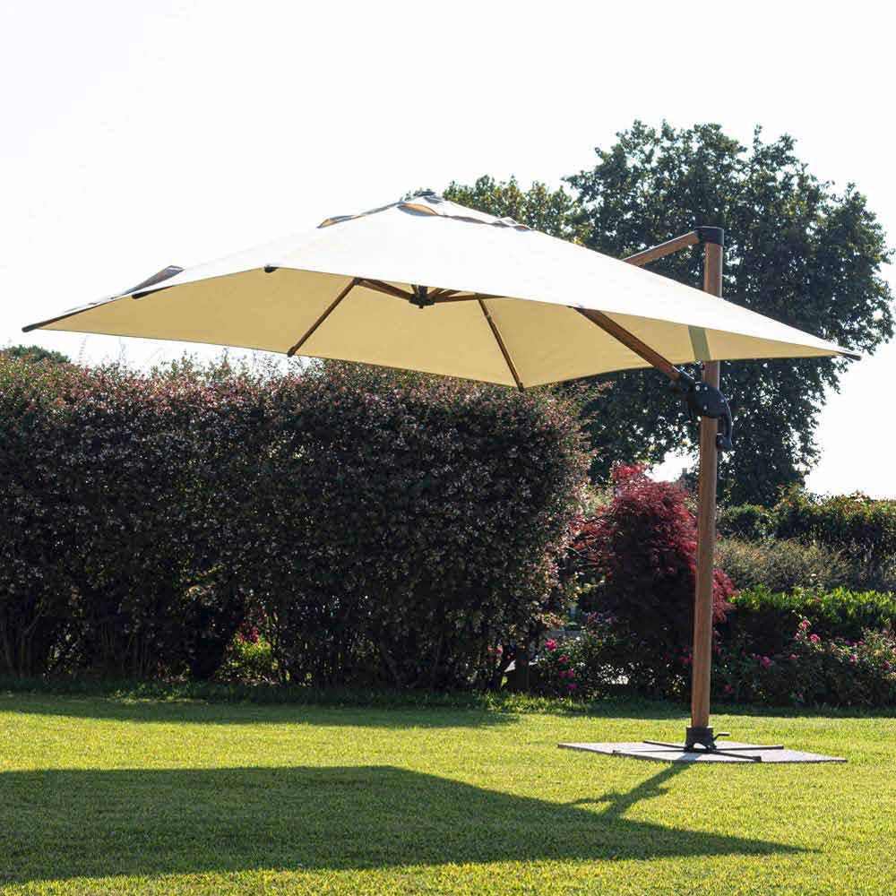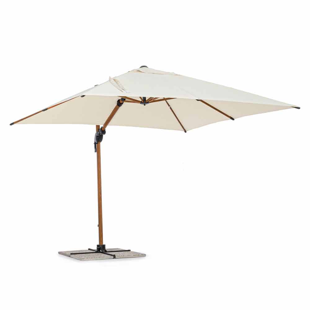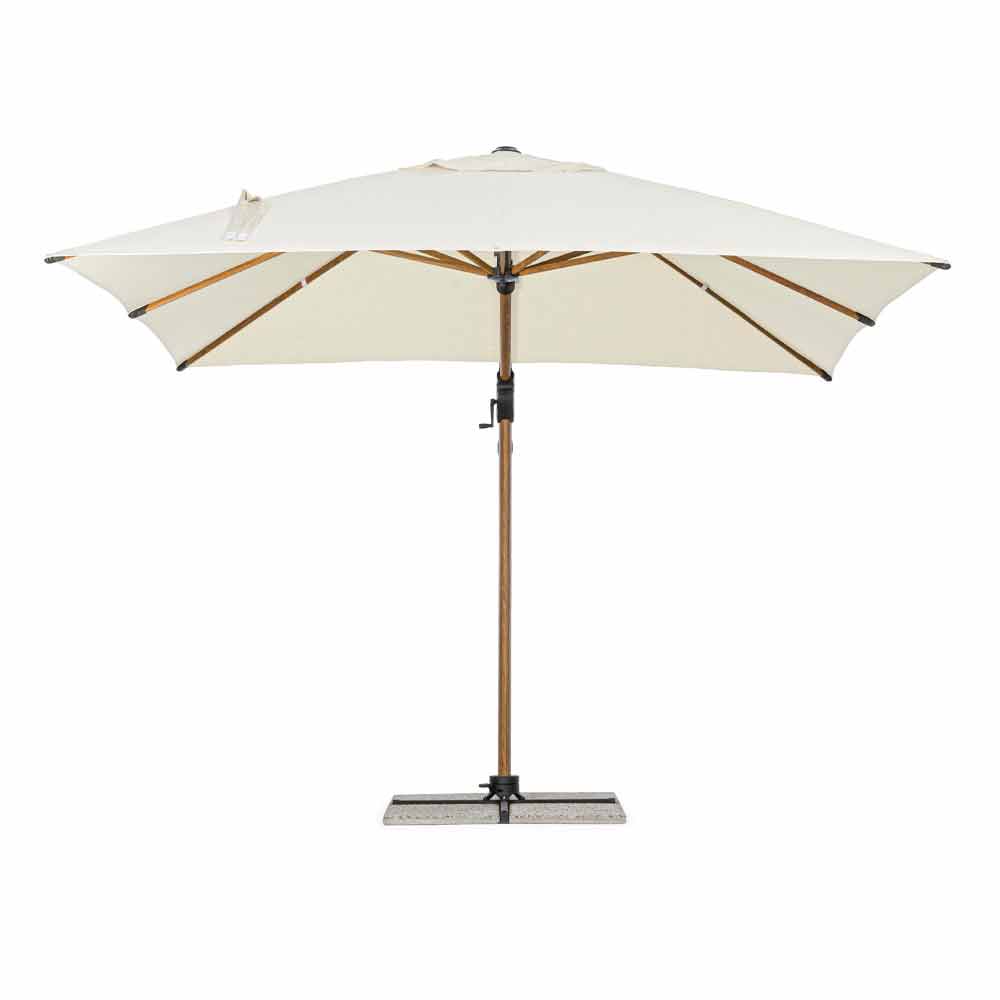 Structure en aluminium enduit de poudre (polyester) avec effet bois. Mât 90x60mm, 8 nervures 25x17mm. Tissu polyester beige 250gr / m2 avec enduction PA (polyamide). Piétement croisé en acier . Poteau rotatif à 360 ° avec pédale. Inclinaison verticale avec poignée à 6 positions. Équipé d'un système d'inclinaison droite-gauche pour parapluie. Y compris la housse de parapluie.