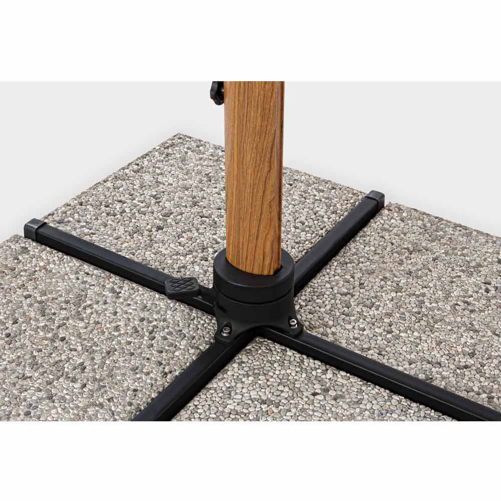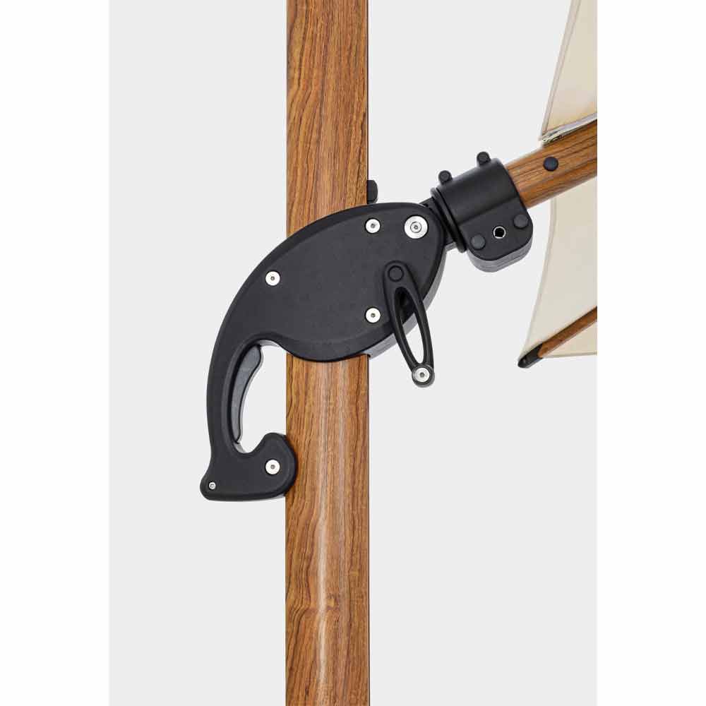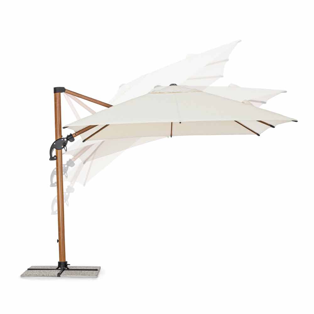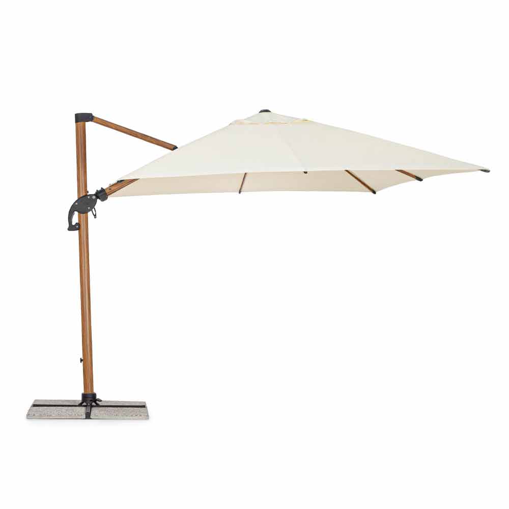 Structure en aluminium enduit de poudre (polyester) avec effet bois. Mât 90x60mm, 8 nervures 25x17mm. Tissu polyester beige 250gr / m2 avec enduction PA (polyamide). Piétement croisé en acier . Poteau rotatif à 360 ° avec pédale. Inclinaison verticale avec poignée à 6 positions. Équipé d'un système d'inclinaison droite-gauche pour parapluie. Y compris la housse de parapluie.