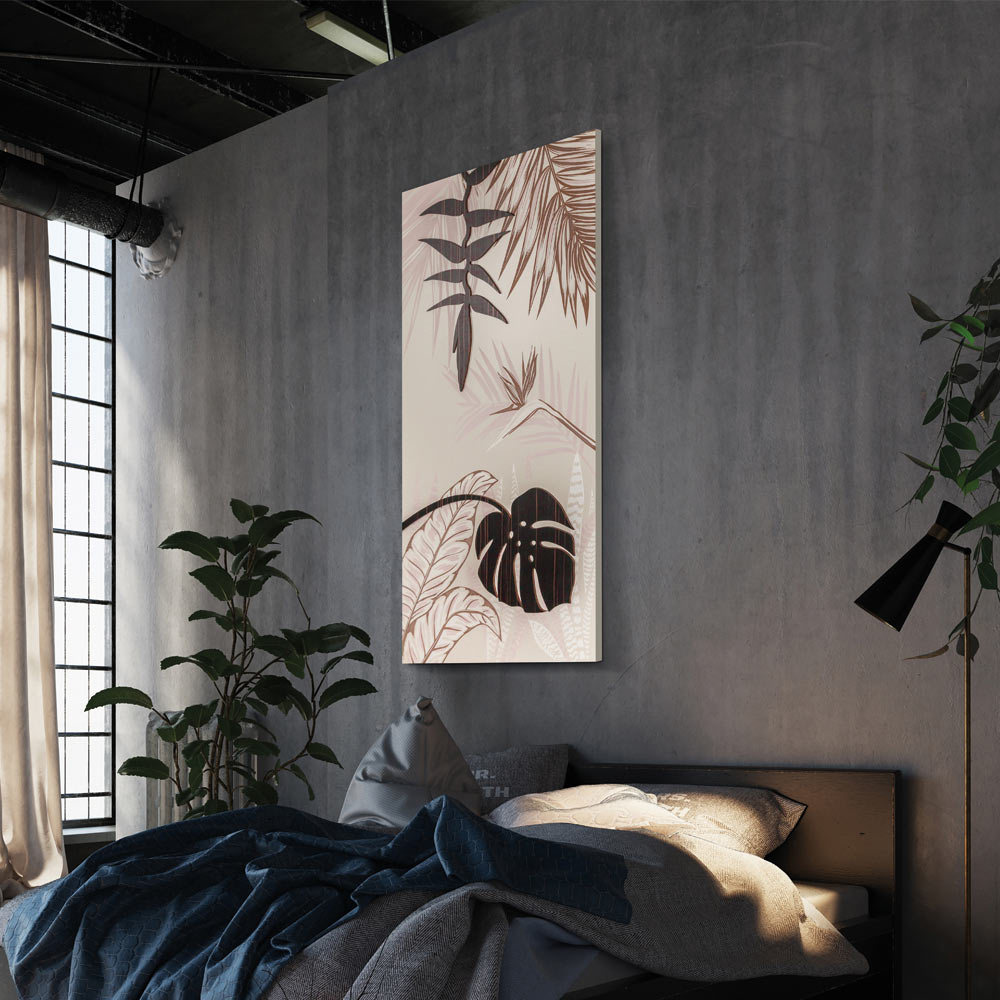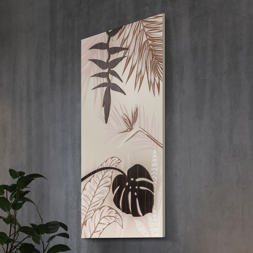 Le panneau décoratif est réalisé à l'aide de la technique de marquage au laser qui crée un bas-relief sur le matériau, créant différents dégradés de couleurs des feuilles créées sur le panneau. La peinture est en bois laqué sable mat avec des applications en bois d'ébène . Les autres couleurs sur le panneau, comme le rose, le marron sont données par marquage laser.