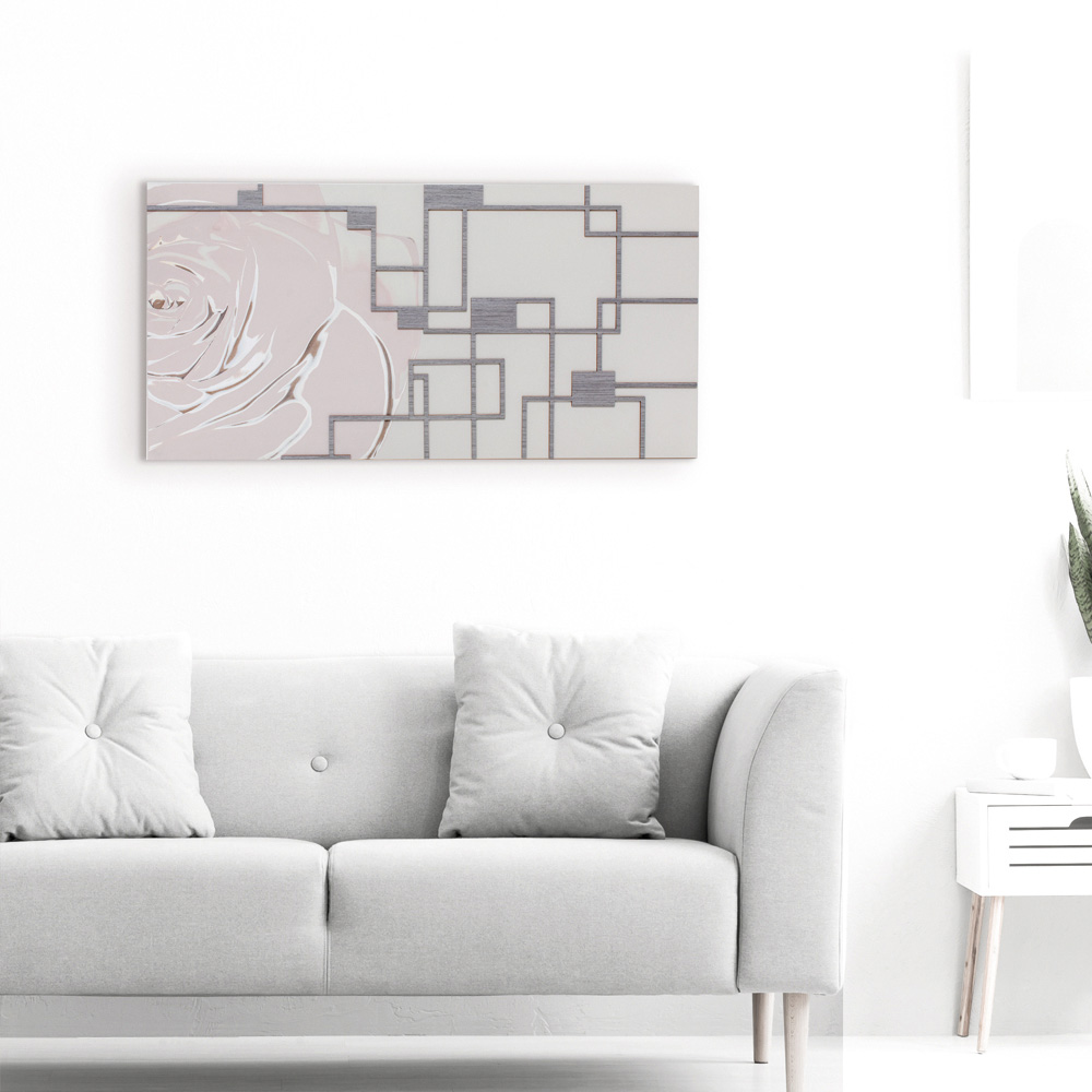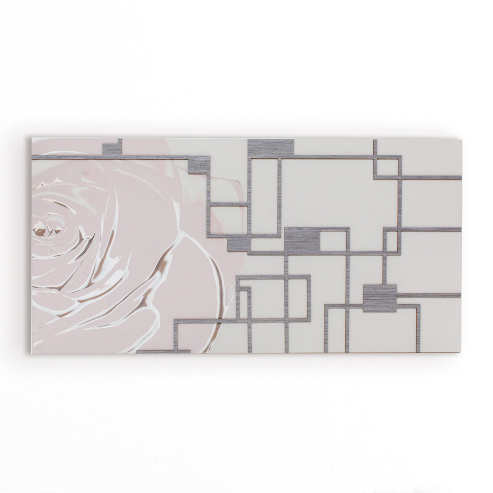 Le panneau décoratif est réalisé à l'aide de la technique de marquage au laser qui crée un bas-relief sur le matériau, créant différents dégradés de couleurs des pétales créés sur le panneau. Le cadre est en bois laqué sable avec des applications grises . De douces nuances de rose jouent avec le décor géométrique en bois gris.