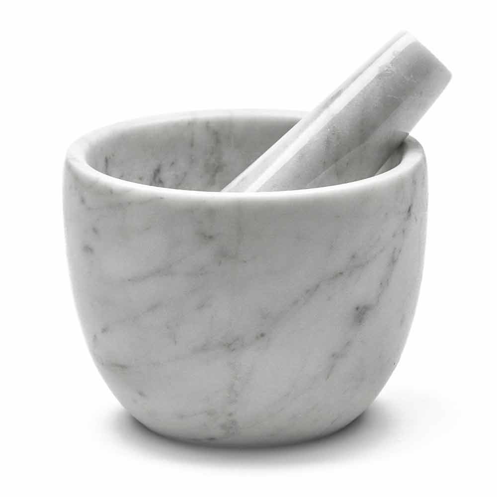 Petit mortier avec pilon entièrement en marbre blanc de Carrare de haute qualité. C'est une pièce unique car chaque bloc de marbre utilisé diffère des autres pour les veines et les nuances. Le marbre blanc de Carrare utilisé pour la création de ces produits est fourni par la carrière Poggio Silvestre, source de marbre de première qualité classé depuis le siècle dernier et chaque produit est également fabriqué à la main par des professionnels spécialisés dans le traitement du marbre depuis des générations.