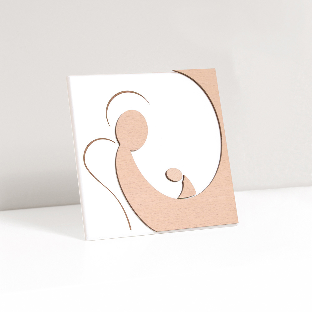 Image sacrée avec mère et enfant en bois naturel appliqué. Panneau en bois laqué blanc avec pied de support et trou pour l'accrocher au mur.