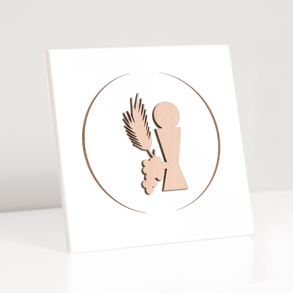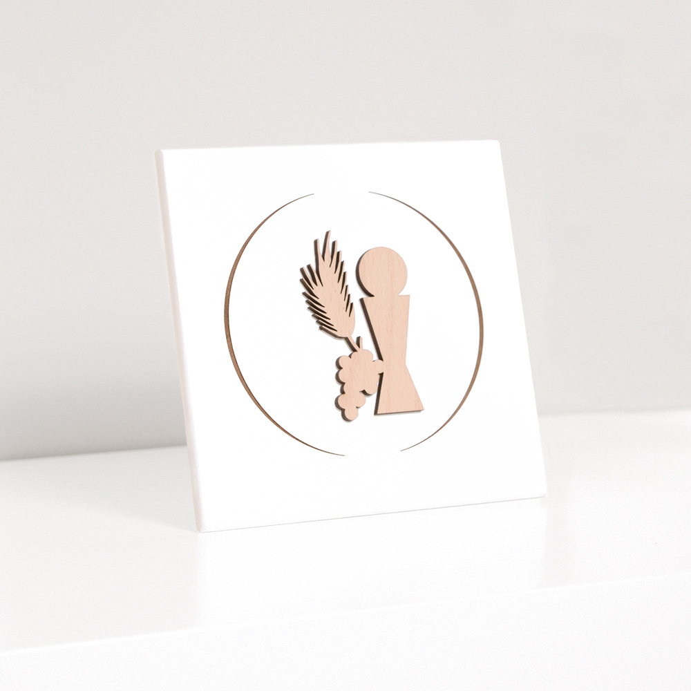 Image sacrée avec calice de communion, oreille et raisins en bois naturel appliqué et gravé au laser. Panneau en bois laqué blanc avec pied de support et trou pour l'accrocher au mur.