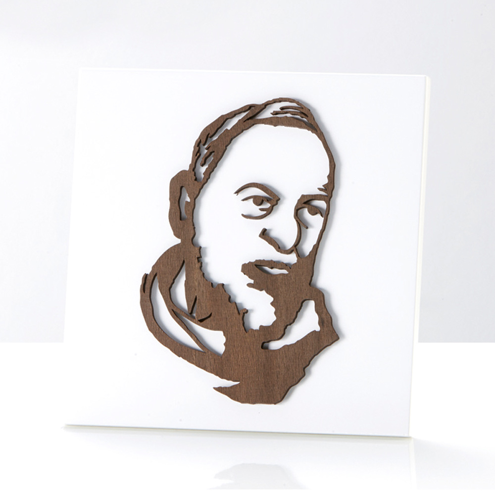 Image sainte avec Padre Pio en bois wengé appliqué. Panneau en bois laqué blanc avec pied de support et trou pour l'accrocher au mur.