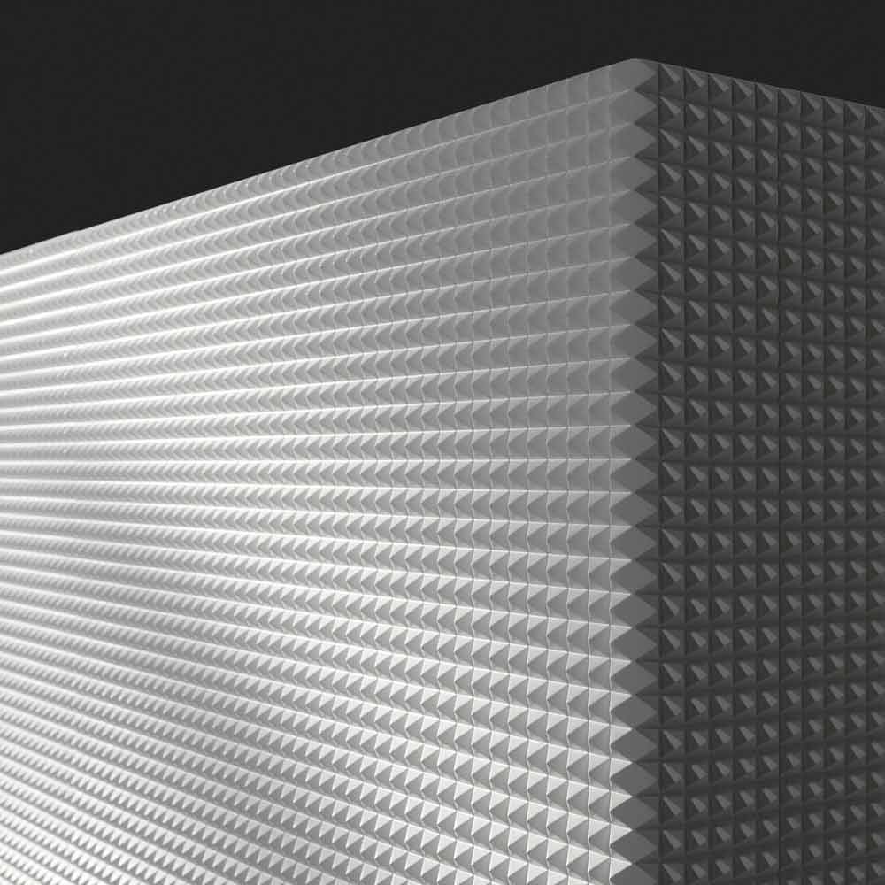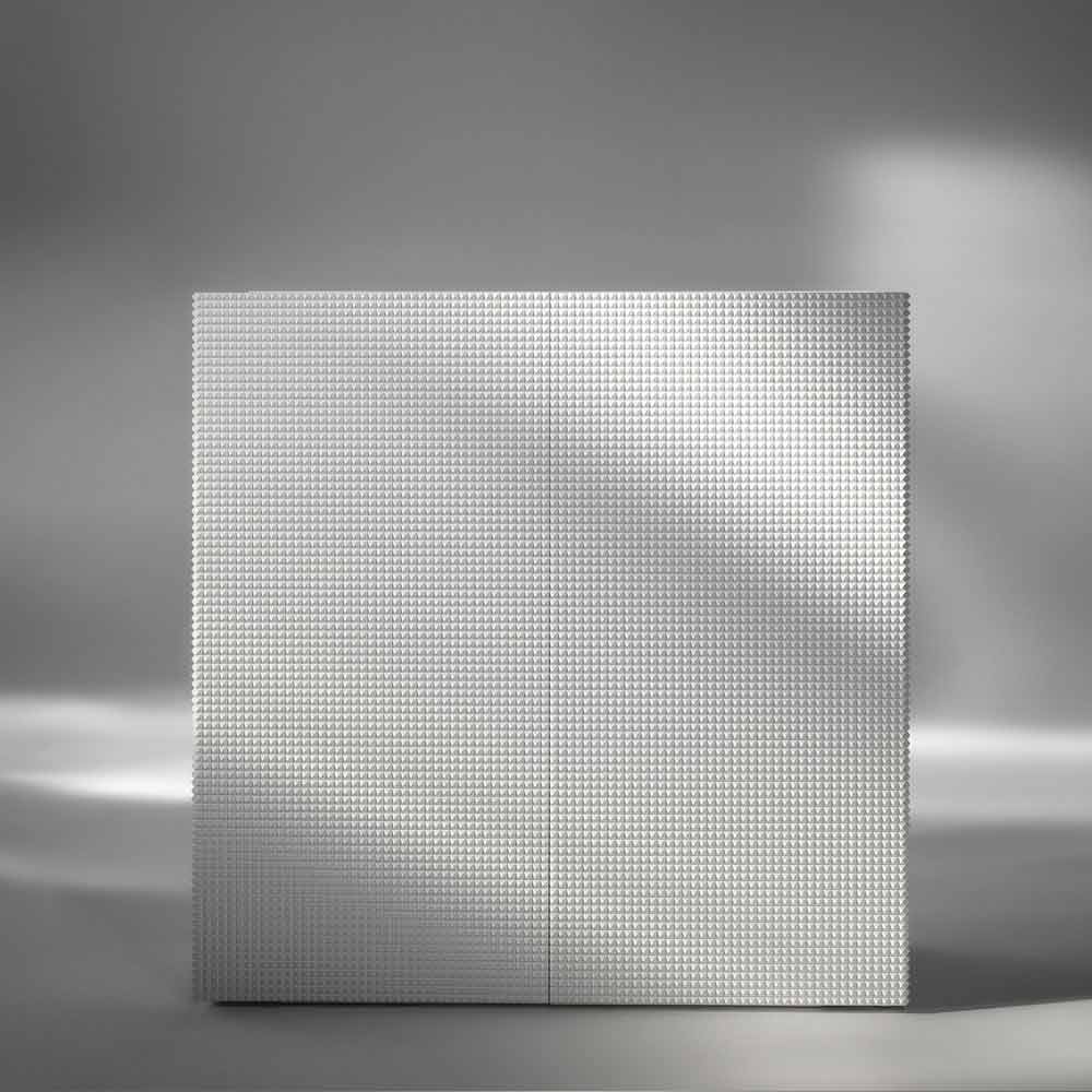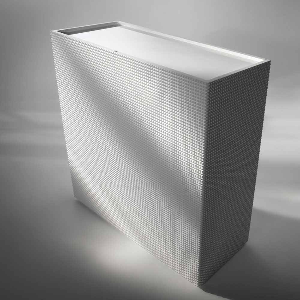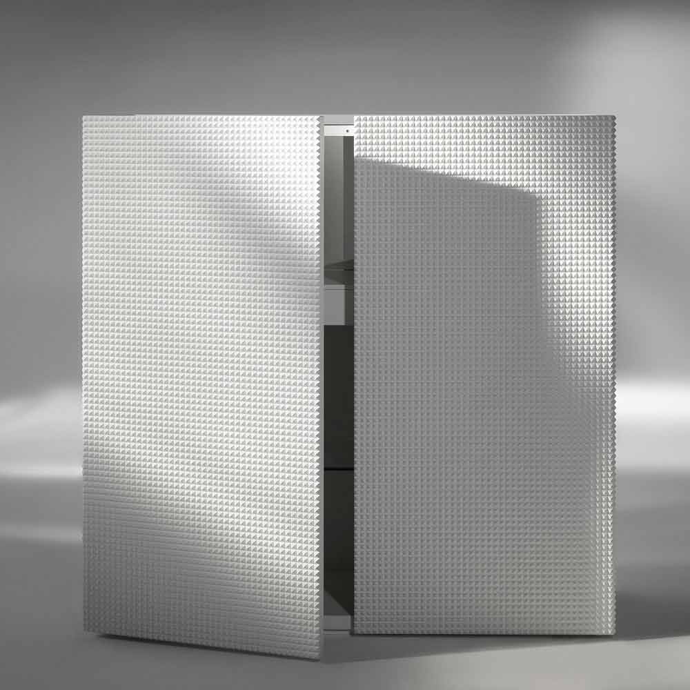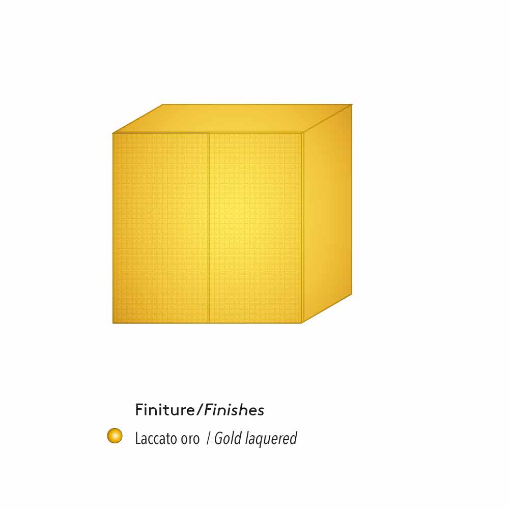 Étagèr interne en cristal et finition satinée. Disponible en version blanc laqué satiné, noir laqué satiné, ou en or laqué satiné.