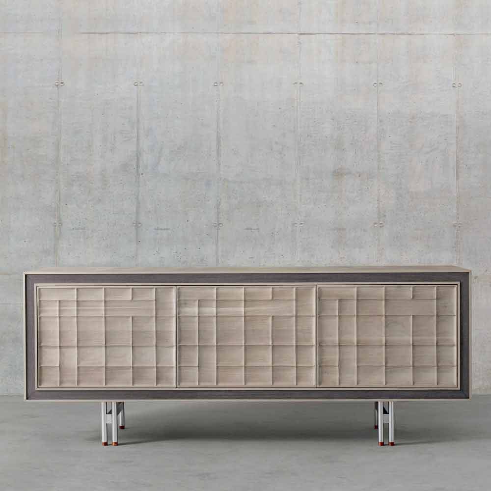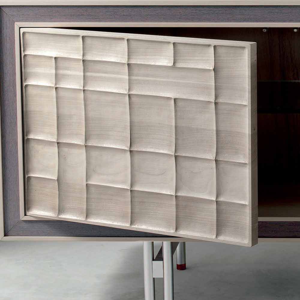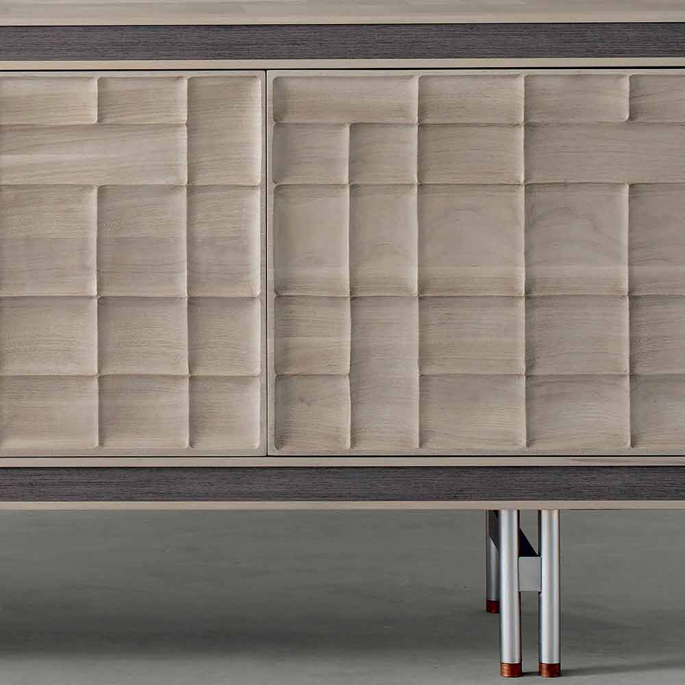 Le jeu de lumière et d'ombre créé par le traitement particulier des portes reprend les traits de la tradition pour les transformer en œuvre de contemporanéité. L'essence de noyer améliore l'équilibre formel du buffet fin à trois portes.