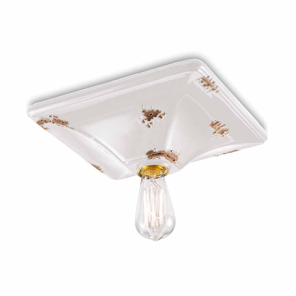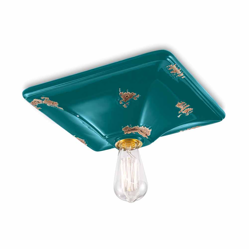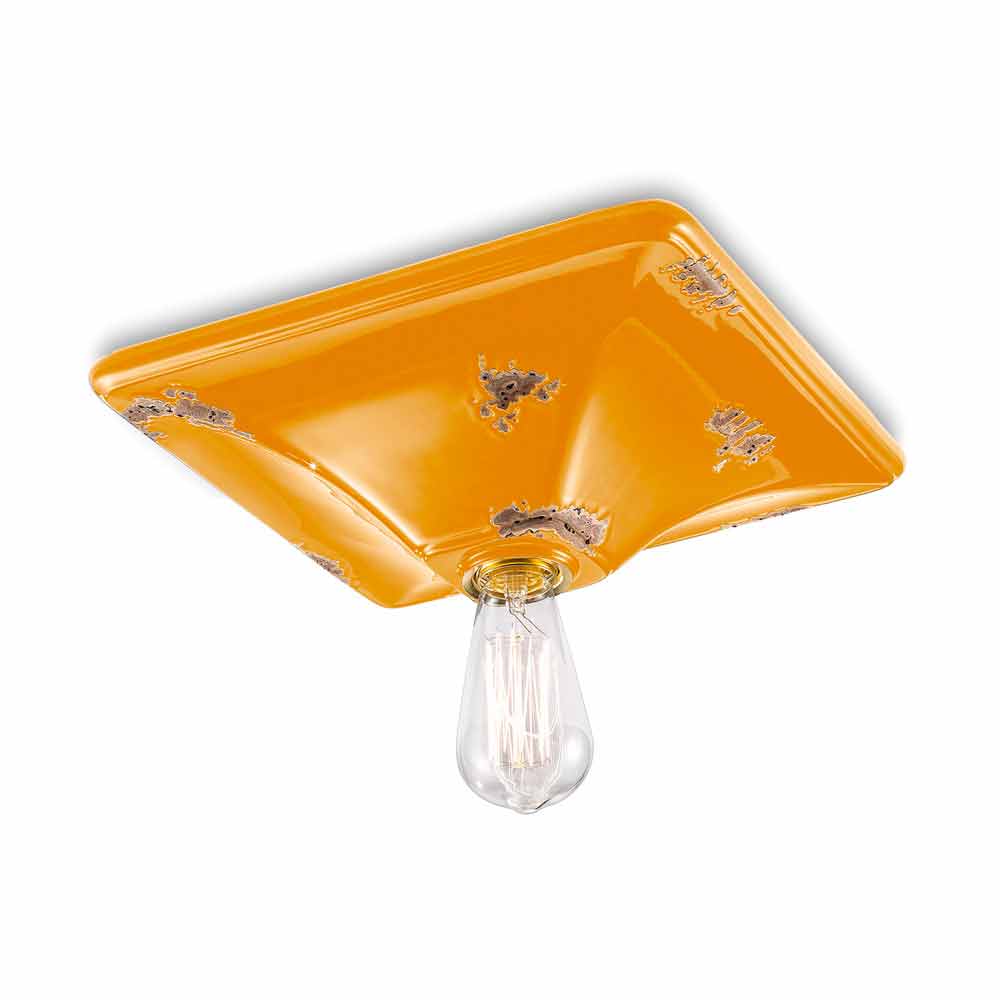 Plafonnier style rétro en céramique Karen Ferroluce Karen est un plafonnier fantastique, fabriqué à la main en céramique par des artisans qualifiés en Italie. Karen est un plafonnier minimal et fonctionnel, composé d'une base de forme carrée. La particularité de cette lampe réside dans le traitement de sa finition extérieure, décorée de manière à ce que le temps ait marqué son chemin. La reproduction de l'érosion du temps combinée aux surfaces brillantes donne cette valeur supplémentaire à ce plafonnier. Idéal pour les environnements avec un style urbain et une saveur vintage. Karen est composé d'un design essentiel et élégant, qui préserve l'essentialité d'utilisation et rassure avec un équilibre délicat entre les formes et les tons. Des petits détails pour un grand effet au goût d'antique ! Lampe disponible en différentes finitions. Consultez le nuancier et entrez le code de la finition souhaitée dans la case appropriée !