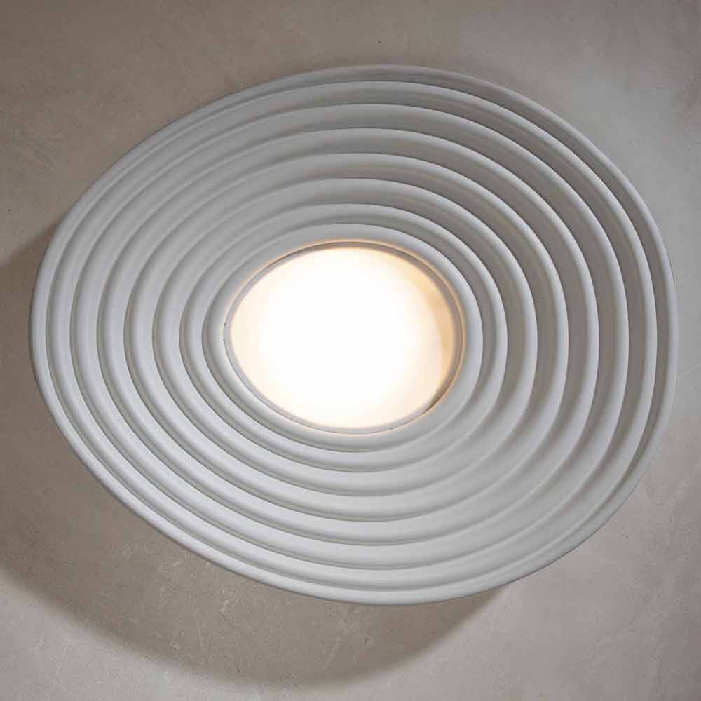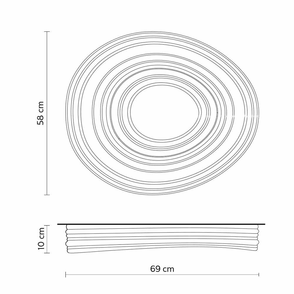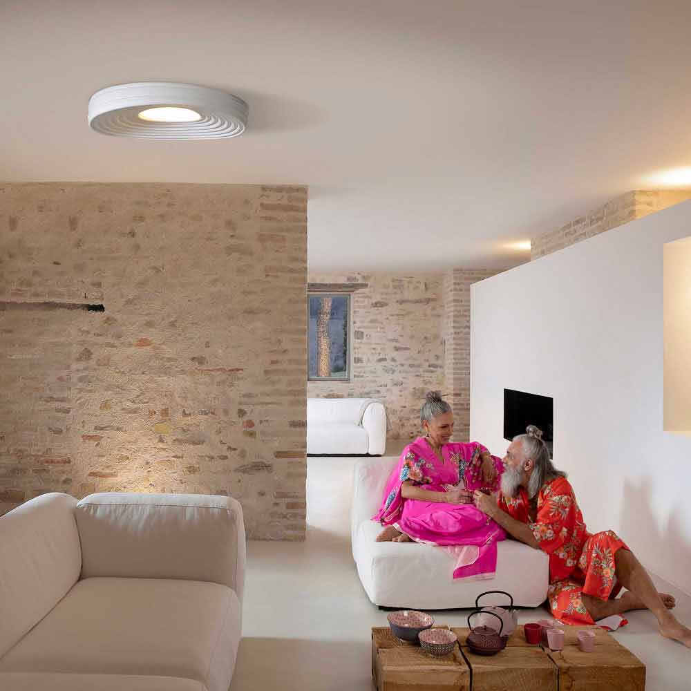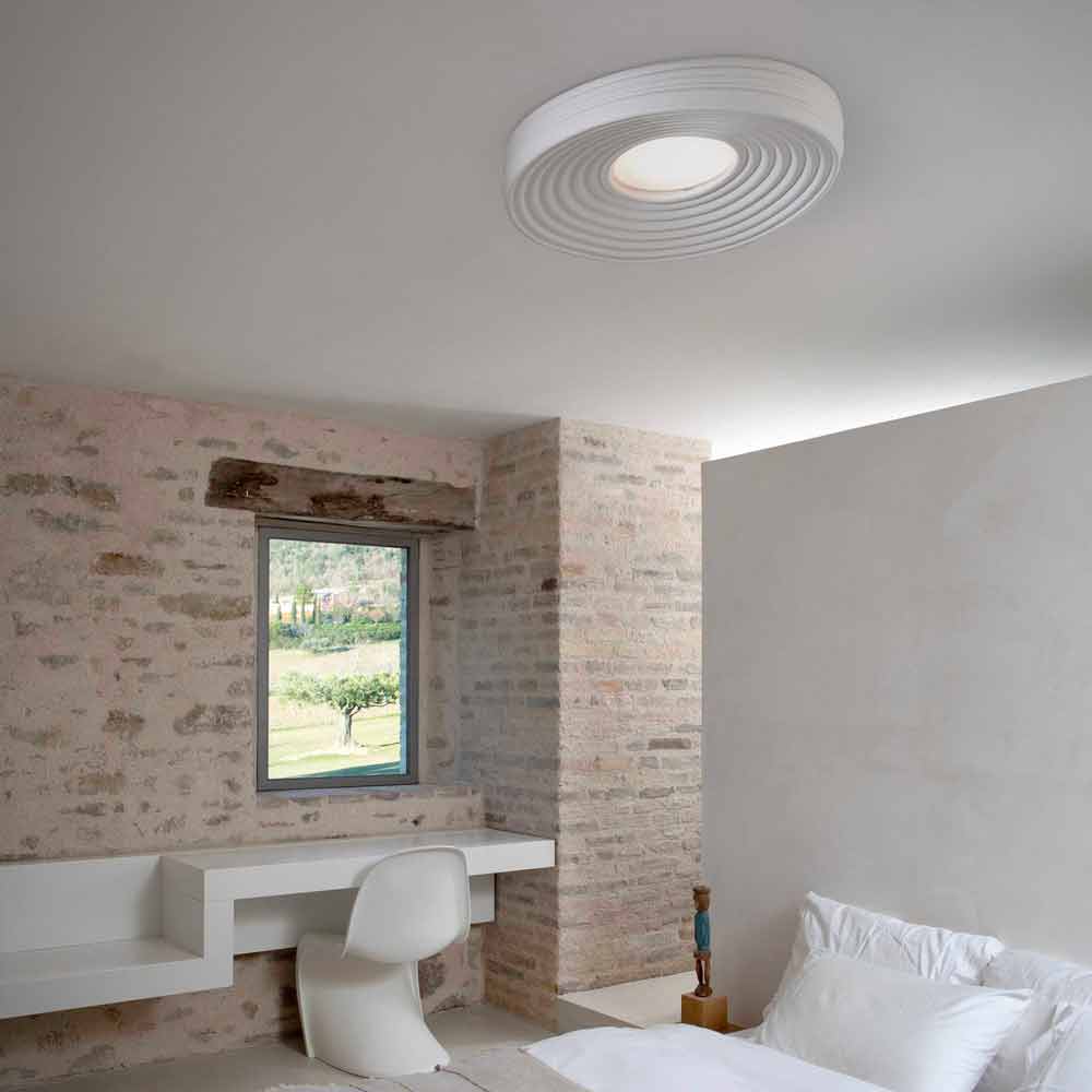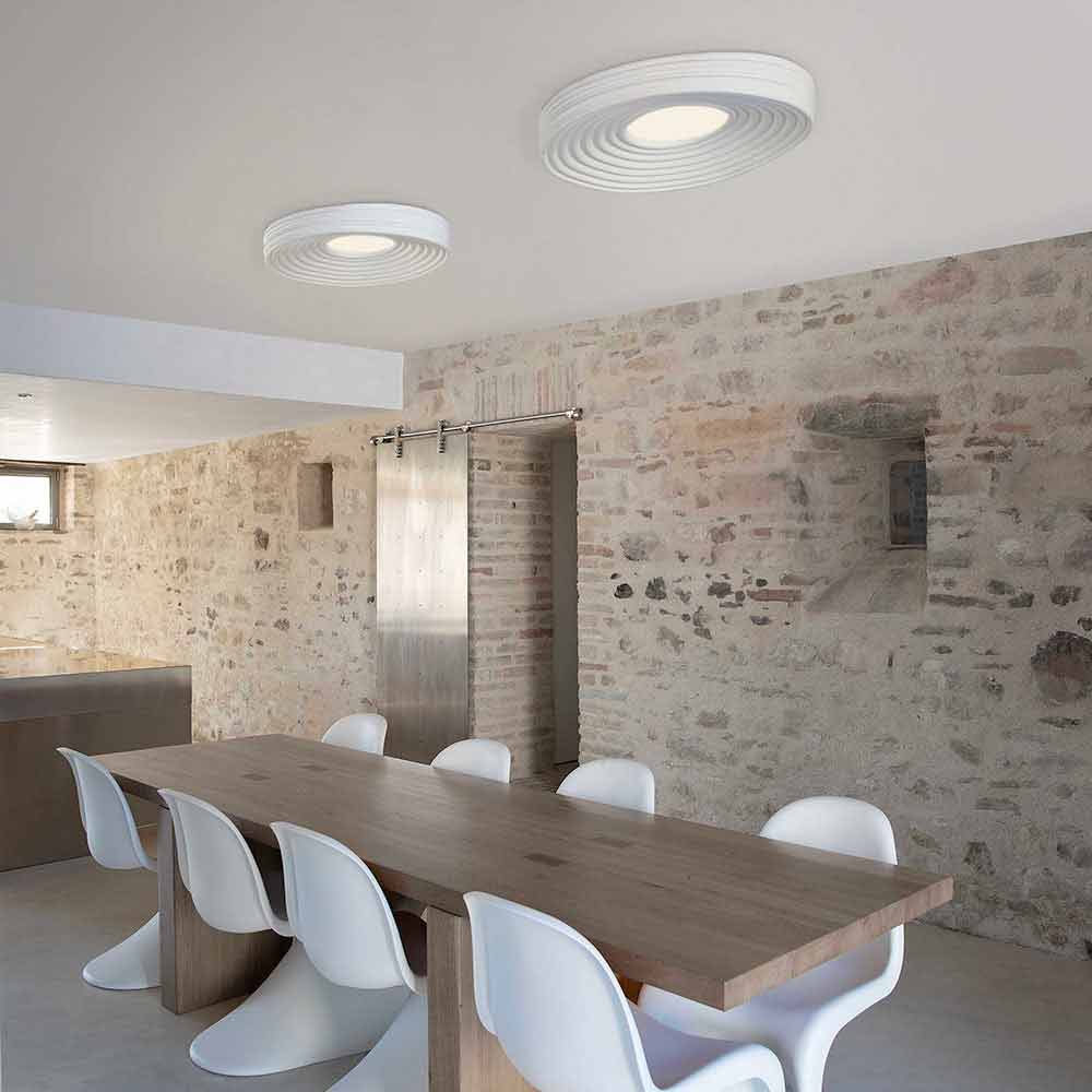 Ce plafonnier original et singulier crée de merveilleux jeux de lumière grâce à la partie centrale qui garantit un éclairage direct et qui se propage à la surface de la lampe en se reflétant en cercles concentriques.