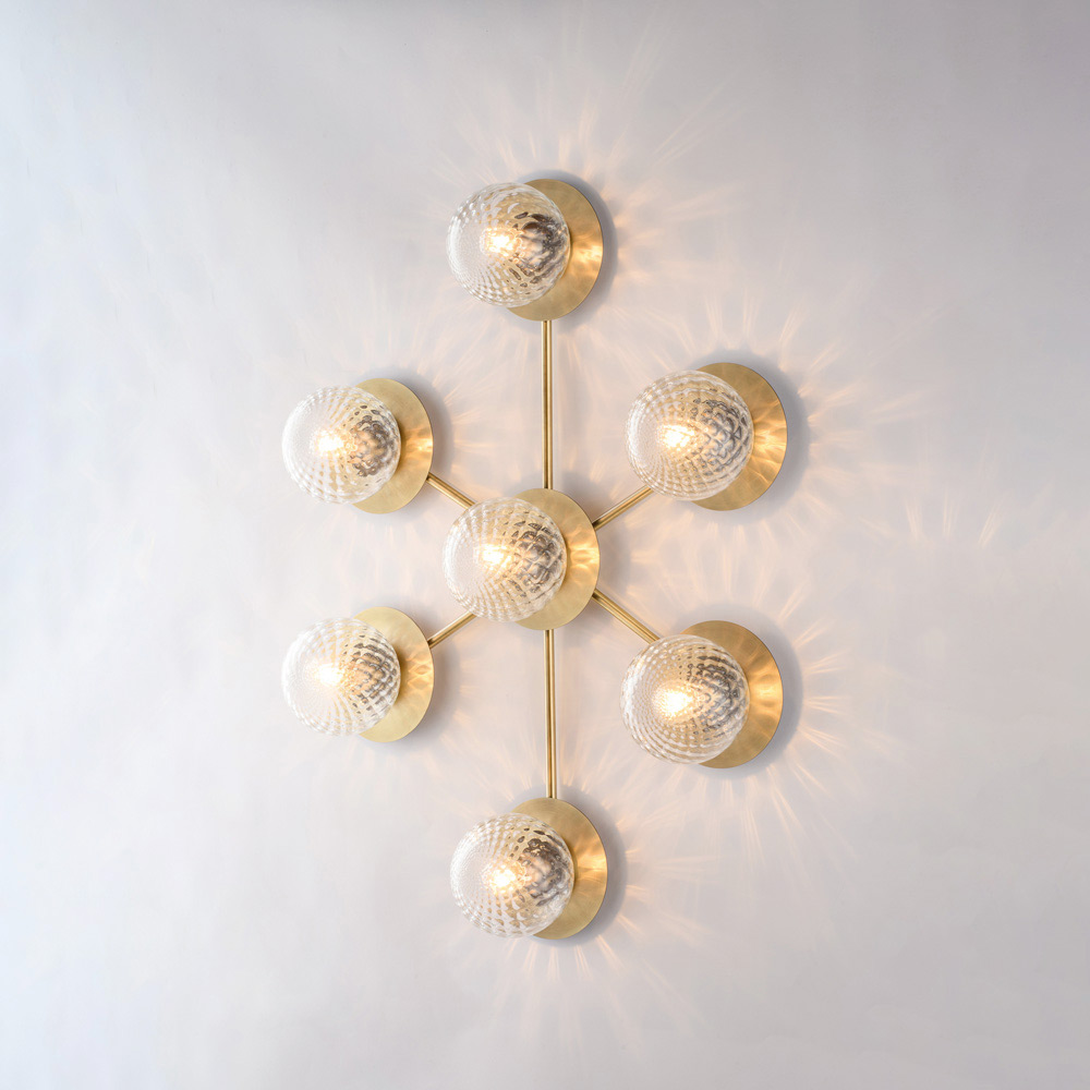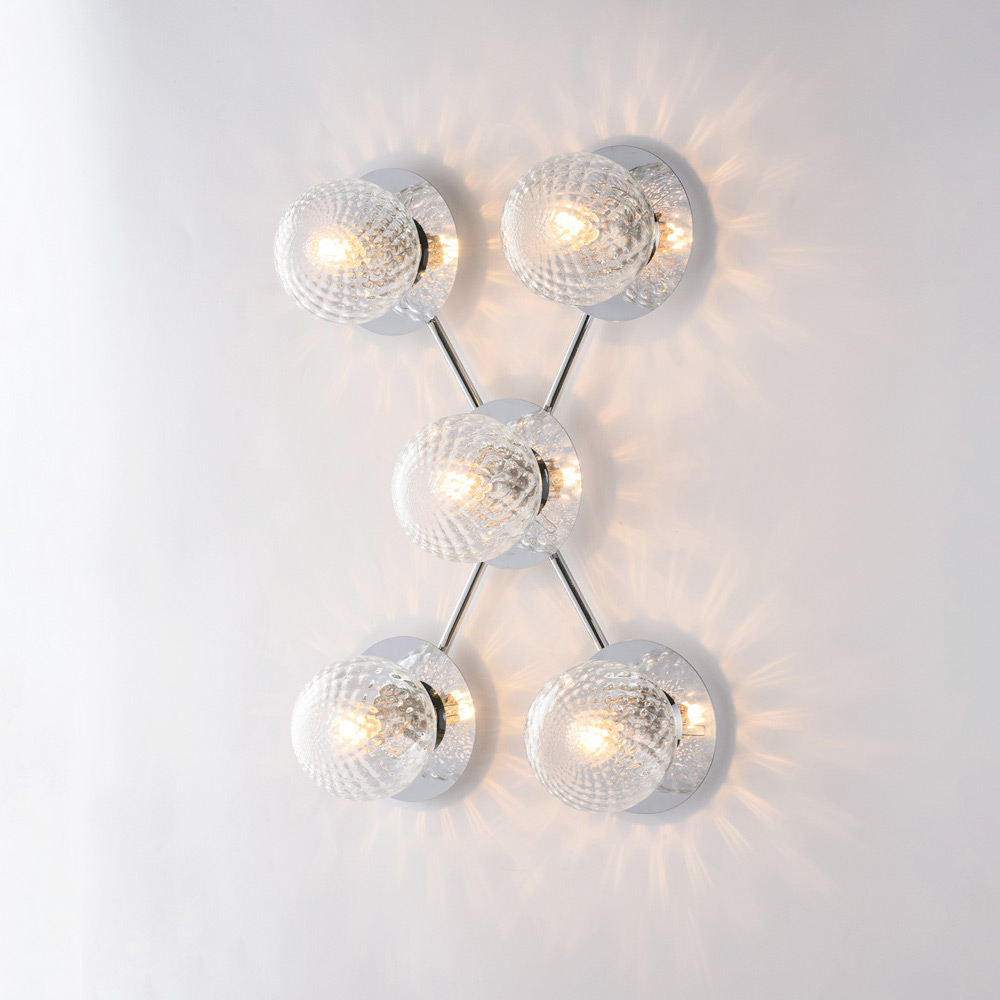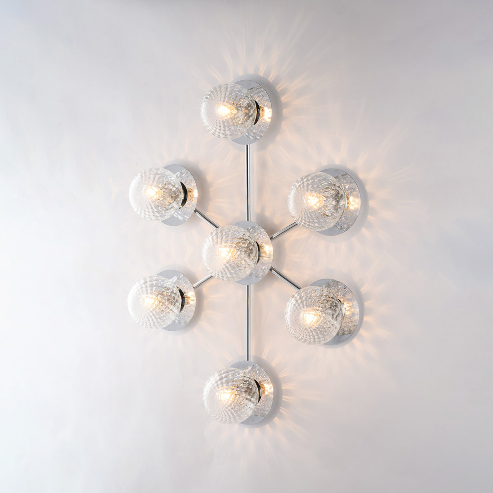 Spectaculaire et contemporain, ce plafonnier en fer forgé, réalisé artisanalement, se distingue par sa composition dynamique et moderne. Sa structure ramifiée abrite des diffuseurs sphériques en verre, disposés de façon harmonieuse, créant un jeu de lumière et de reflets suggestif qui met en valeur le plafond et illumine uniformément la pièce.