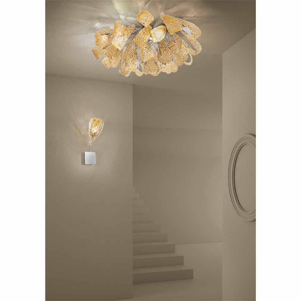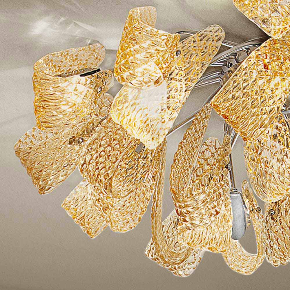 Plafonnier élégant et majestueux fabriqué en Italie en verre vénitien finition ambre fabriqué à la main avec des détails en métal chromé poli . Une idée de luminaire composée de rubans voluptueux et de textures insolites qui donnent son originalité esthétique et un sens du dynamisme . Ce qui frappe, c'est la texture géométrique qui recouvre la surface de verre sur laquelle la lumière se reflète dans les détails métalliques pour de merveilleux jeux de reflets . Le résultat est un magnifique plafonnier capable de s'adapter à n'importe quel environnement contemporain et de donner du caractère à des espaces plus classiques, se révélant particulièrement polyvalent.