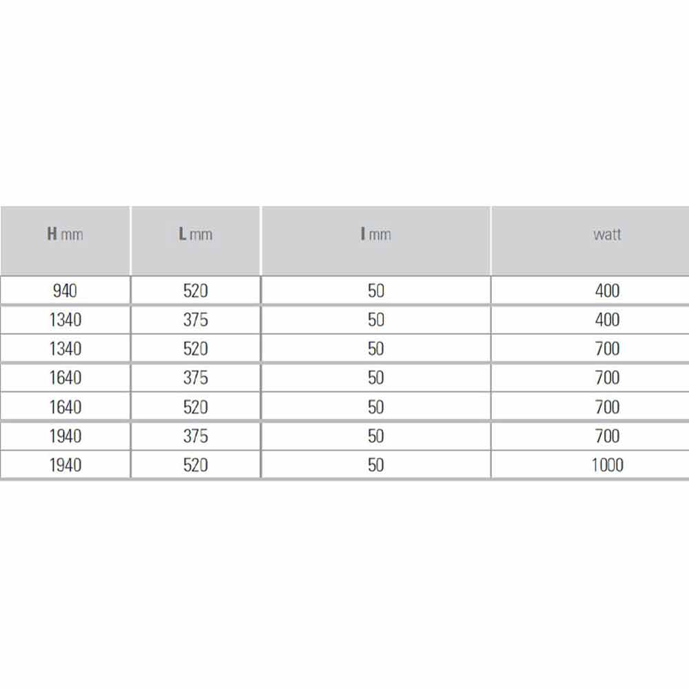 - H 1230 x L 375 x Inter.50 x P 48 mm x Rendement w 400;
