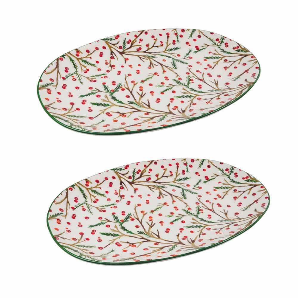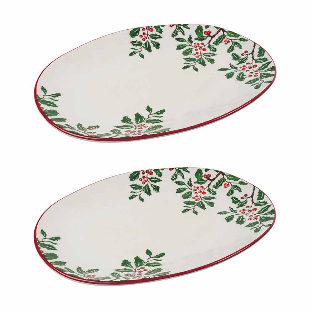 2 plateaux ovales de Noël en dolomite avec décorations au choix entre houx ou baie de boucherie.