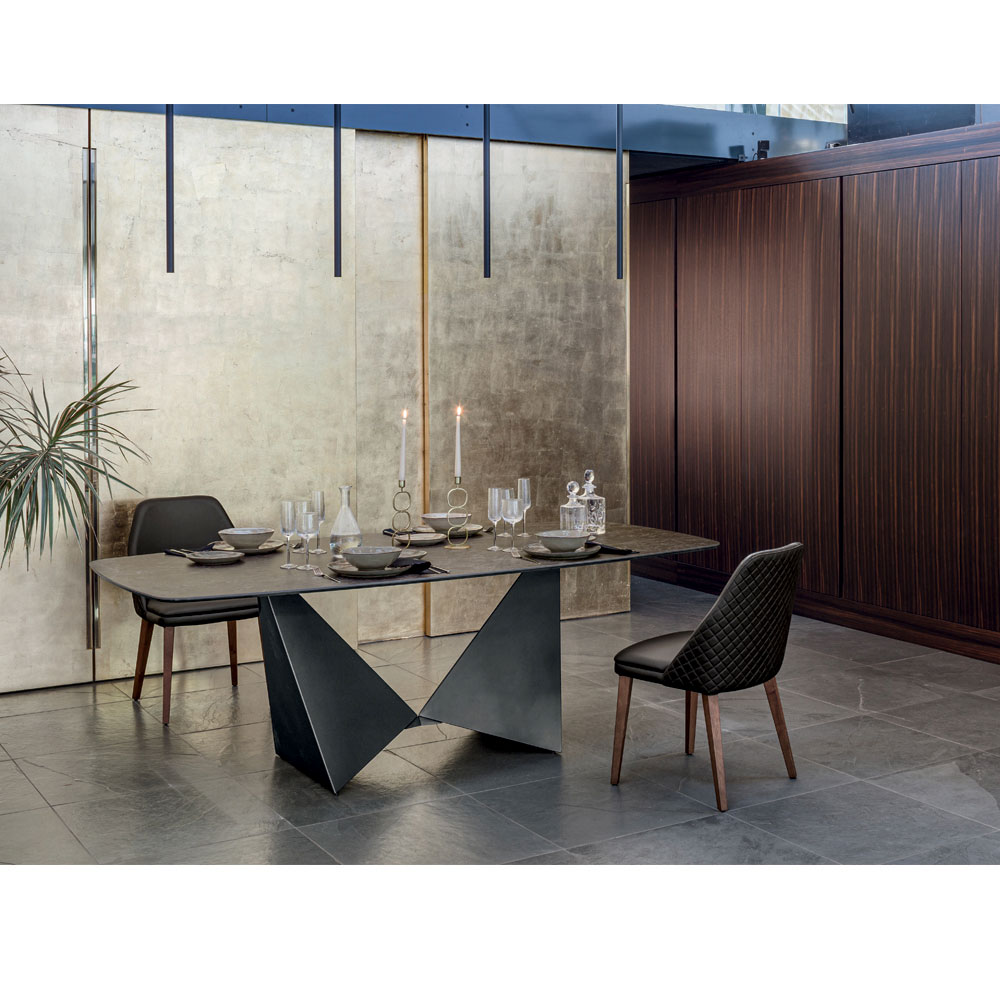 Table à manger avec base en métal et plateau en céramique mate en différentes finitions fabriquées en Italie.