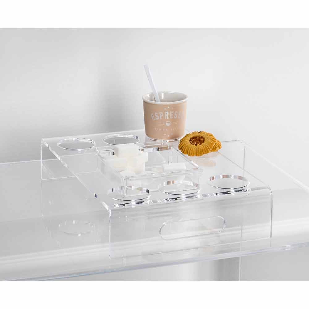 Ces plateaux à café avec poignées sont en plexiglas transparent 100% à partir de polymère vierge et ont un design élégant et raffiné , très résistant.