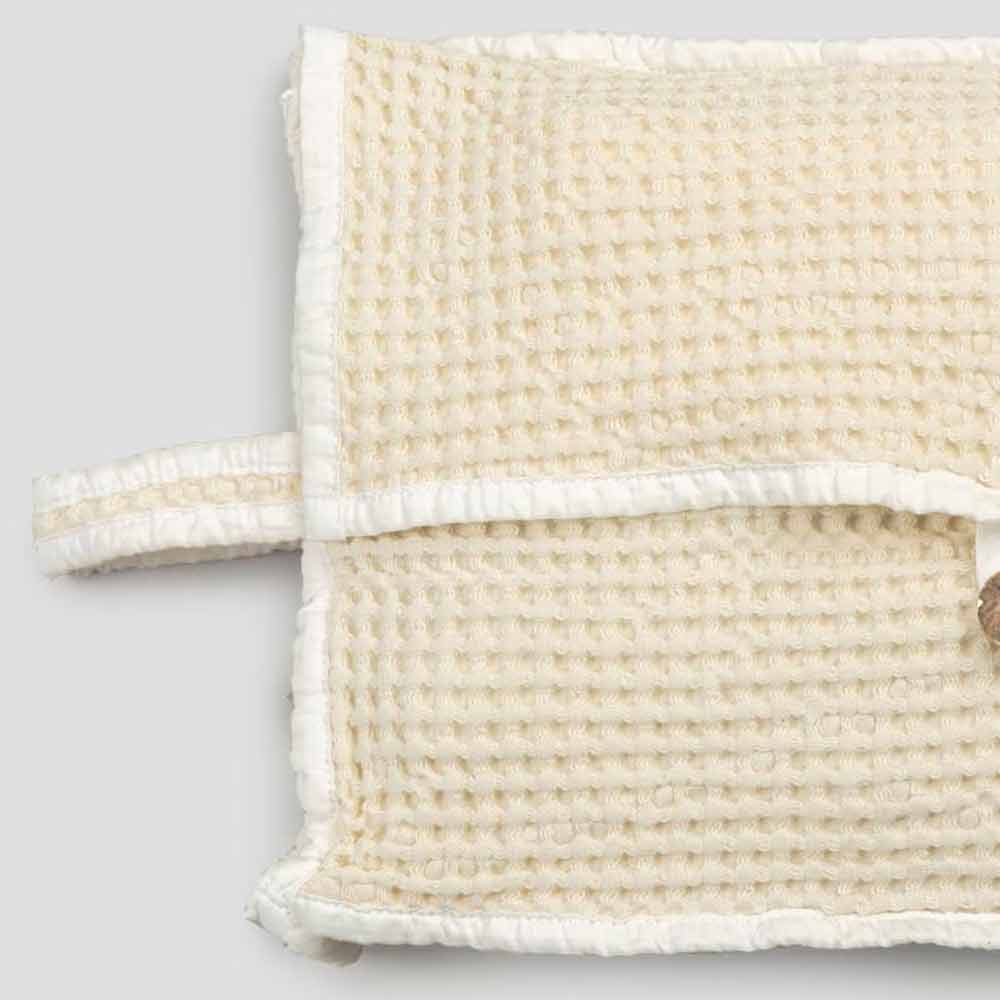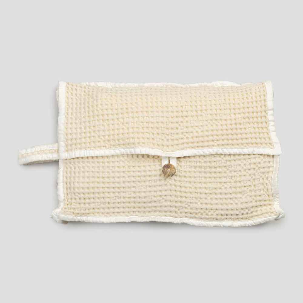 pochette en coton nid d'abeille et la fermeture à bouton Agoya en nacre.