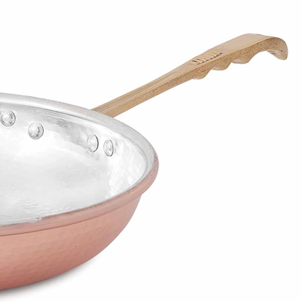 cuivre massif martelé et étamé à la main sur le feu est idéale pour les fritures, les crêpes, les sautés de pâtes ou le glaçage de légumes.