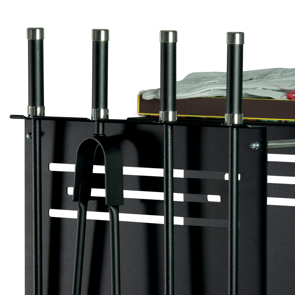 Ce porte-bûches multifonctionnel est un accessoire indispensable pour les amateurs de cheminée. Fabriqué avec une structure métallique robuste, il est équipé de roues pour faciliter le déplacement. L'unité sert non seulement à contenir une bonne quantité de bois de chauffage mais offre également un espace dédié pour les outils nécessaires à la gestion du feu : une pelle, une brosse, une pince et un crochet, maintenant ainsi l'ordre et la praticité.