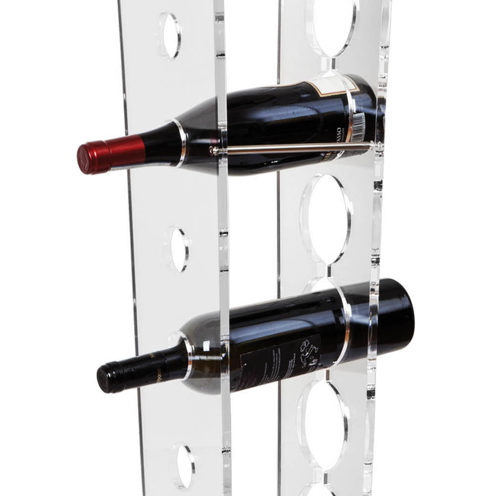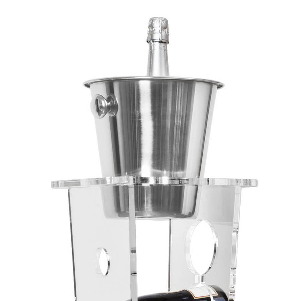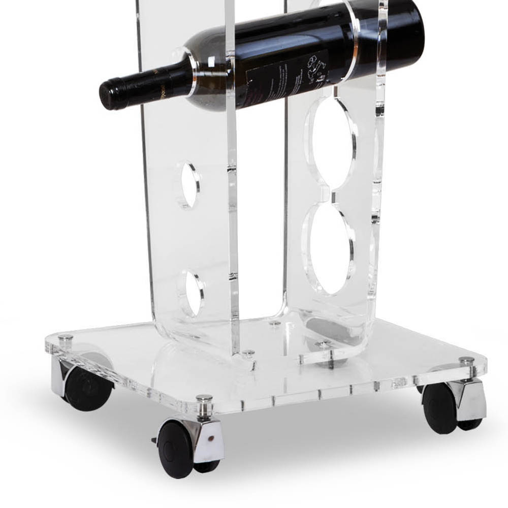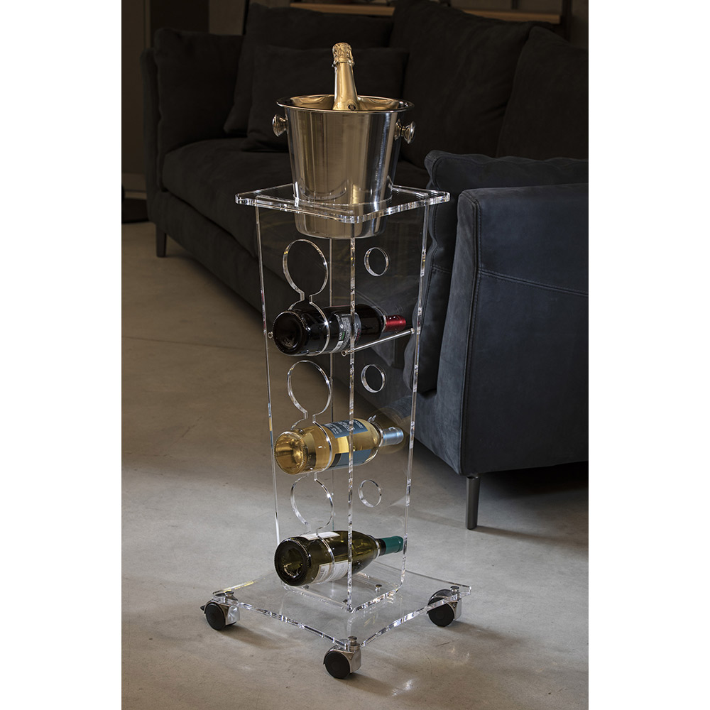 Le porte-bouteille de vin autoportant se caractérise par un design élégant sur des roues entièrement en cristal acrylique transparent. Élégant et fonctionnel, il est capable de ranger jusqu'à 6 bouteilles et se termine par le trou pour le seau à glace , pour un design complet.