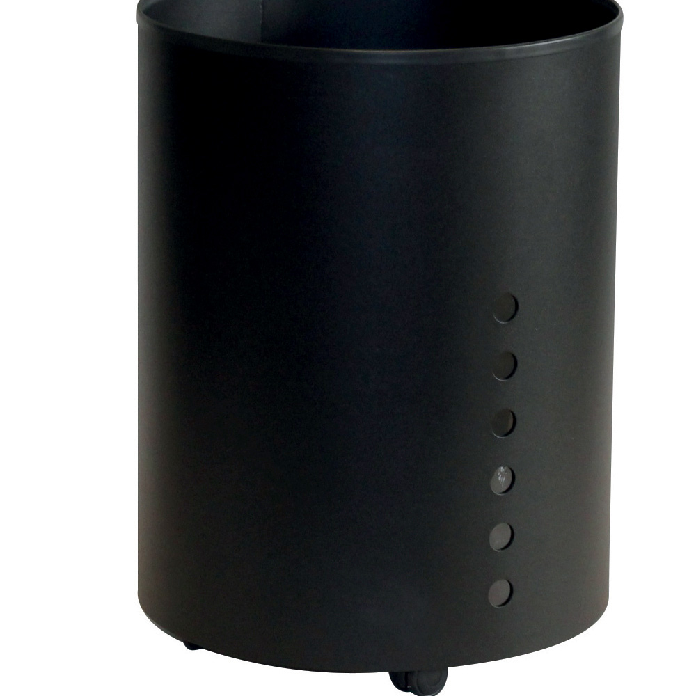 Les perforations sur le côté ne sont pas seulement un détail décoratif mais servent également à indiquer le niveau de pellet, maintenant ainsi le combustible dans des conditions optimales. Les roulettes à la base facilitent le déplacement du récipient, ce qui le rend pratique pour ravitailler la cheminée ou le poêle sans effort.