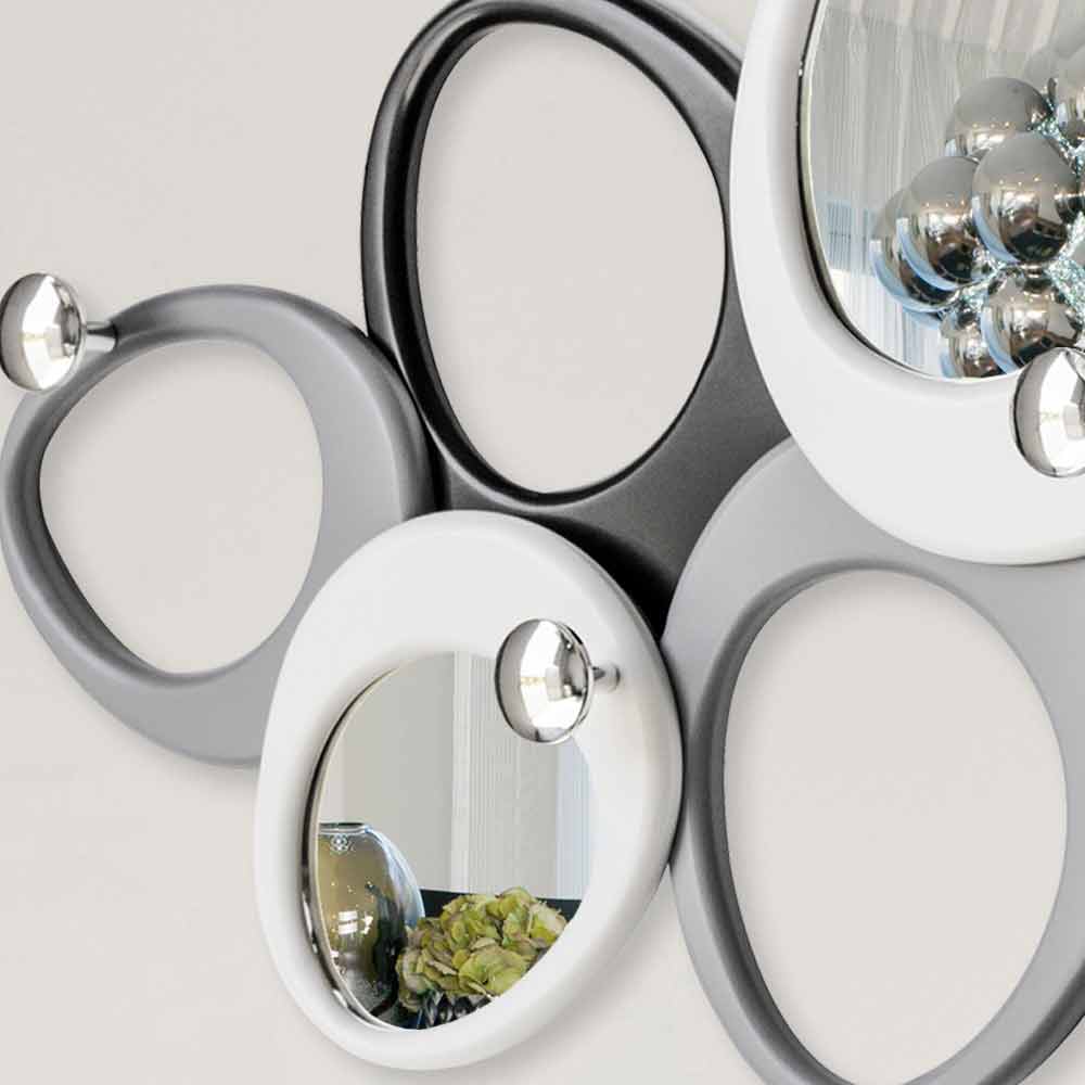 Molecole est décoré à la main. Il inclut trois miroirs et cinq boutons chromés placés sur trois niveaux superposés, dans les couleurs noir lacqué, gris tourterelle et blanc ivoire. Finition brillante.