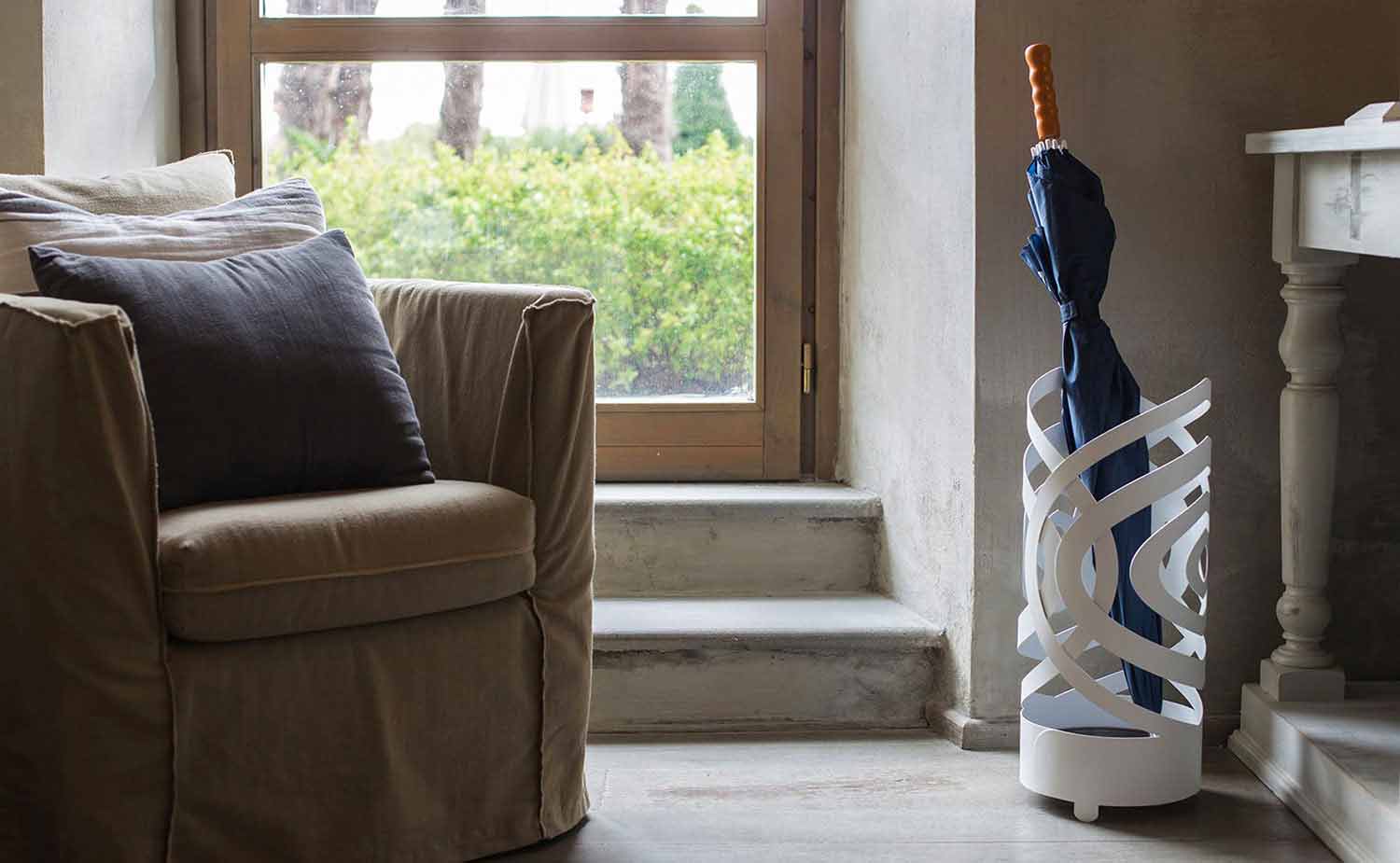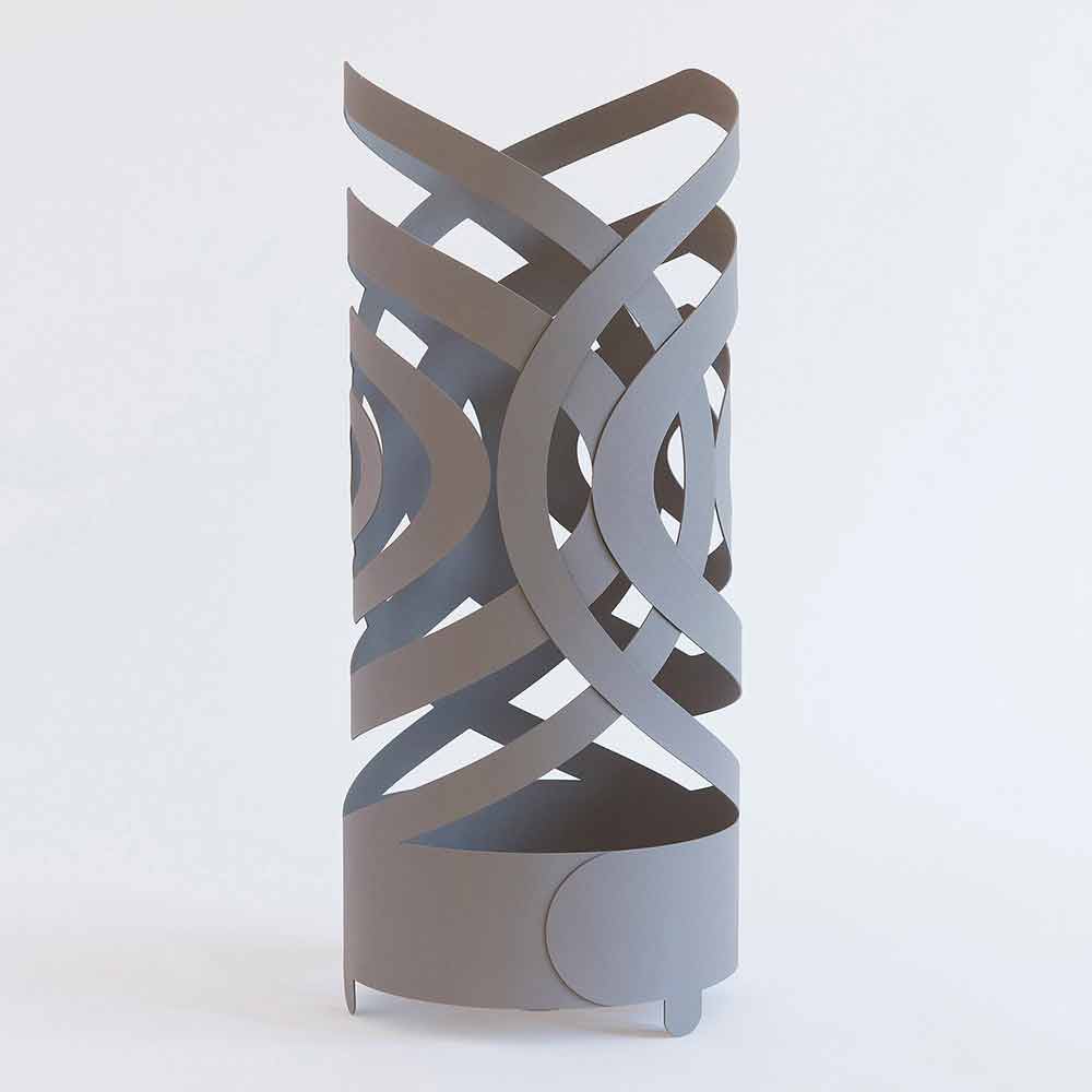 Le porte- parapluie Olfeo est souligné par des lignes particulières rappelant la forme de rubans entrelacés.