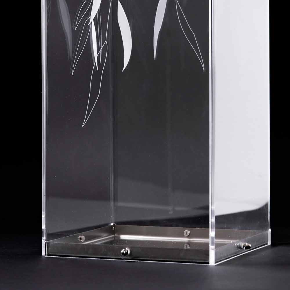 Le porte- parapluies en plexiglas transparent se caractérise par les décorations marquées au laser des feuilles et de la base en acier inoxydable.